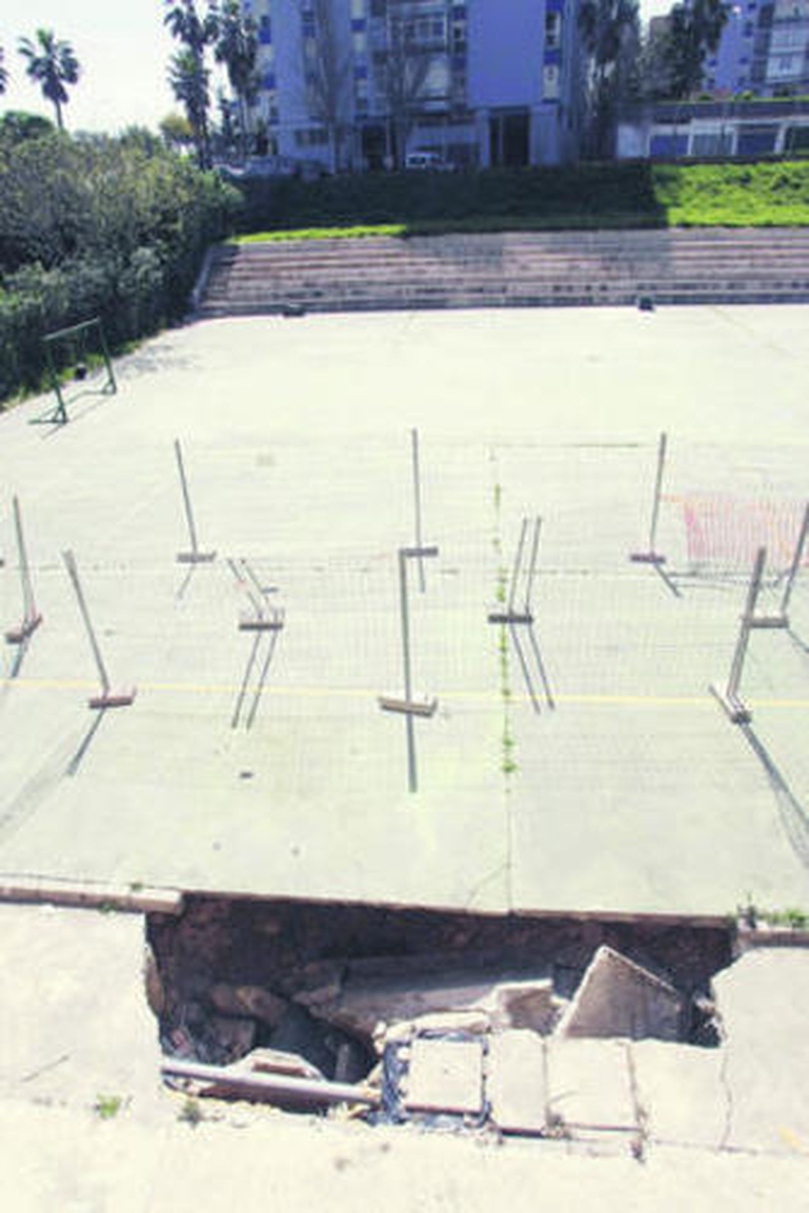 En el patio del Instituto de Enseñanza Secundaria (IES) Levante continúa visible el gran socavón que se produjo el pasado 3 de febrero a causa de las fuertes lluvias, que provocaron la rotura del colector perimetral de aguas pluviales que discurre bajo el centro educativo. Seis meses después y tras las anunciadas obras previstas por parte del Ayuntamiento en reiteradas ocasiones, la pista deportivas sigue mostrando la misma imagen.