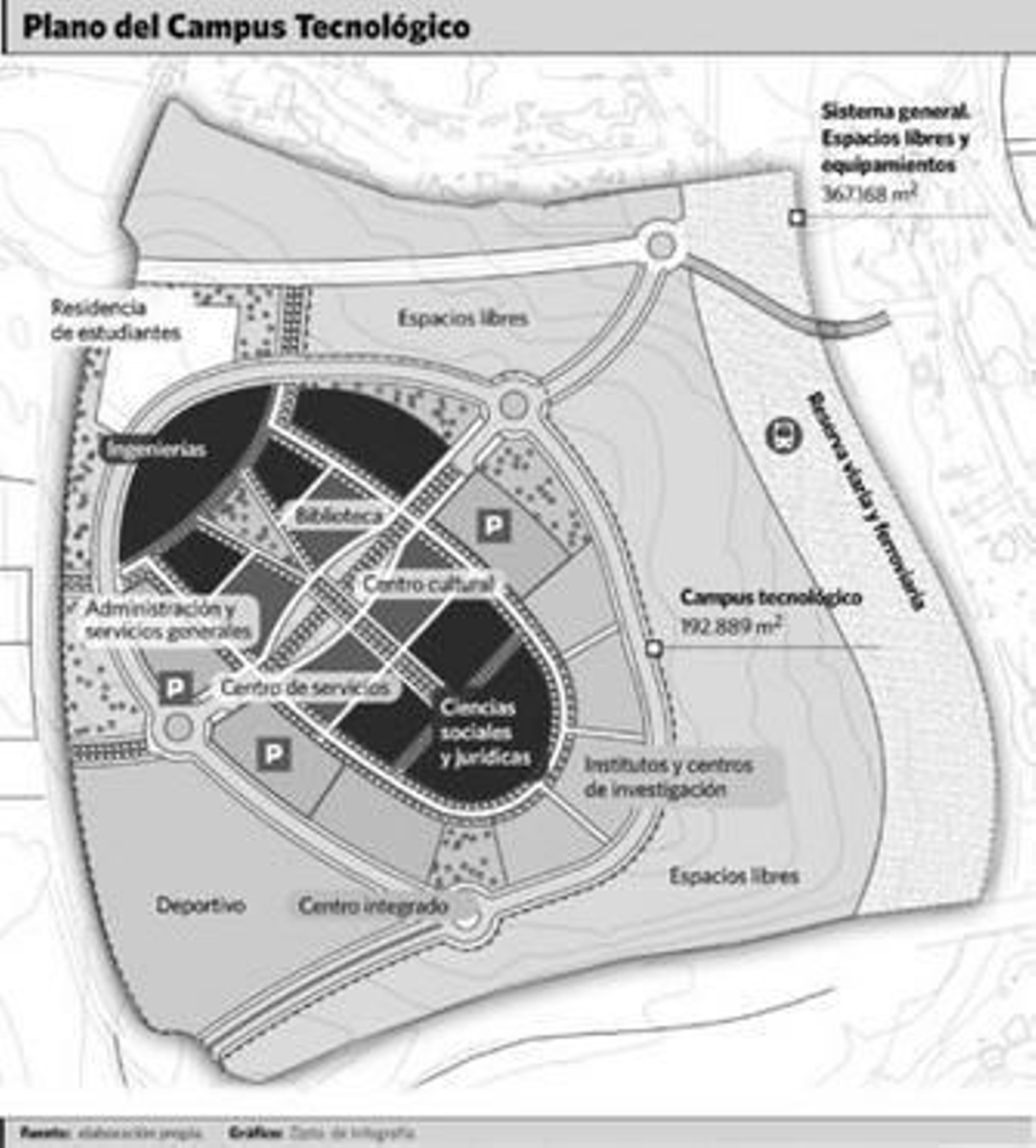 El consejero de Innovación, al presentar el plano de lo que ahora es una idea de cómo puede quedar el diseño del Campus, destacó que los terrenos se hallan en una loma perfectamente visible desde diferentes puntos de la ciudad. Aquí se incluye una vía circular que permite el acceso de vehículos y dentro de ella, en una primera corona, se ubicarán los centros tecnológicos y la formación no reglada, y en la parte central, ya en una zona peatonal, los centros de investigación I+D y las aulas y centros de formación y bibliotecas del área universitaria.