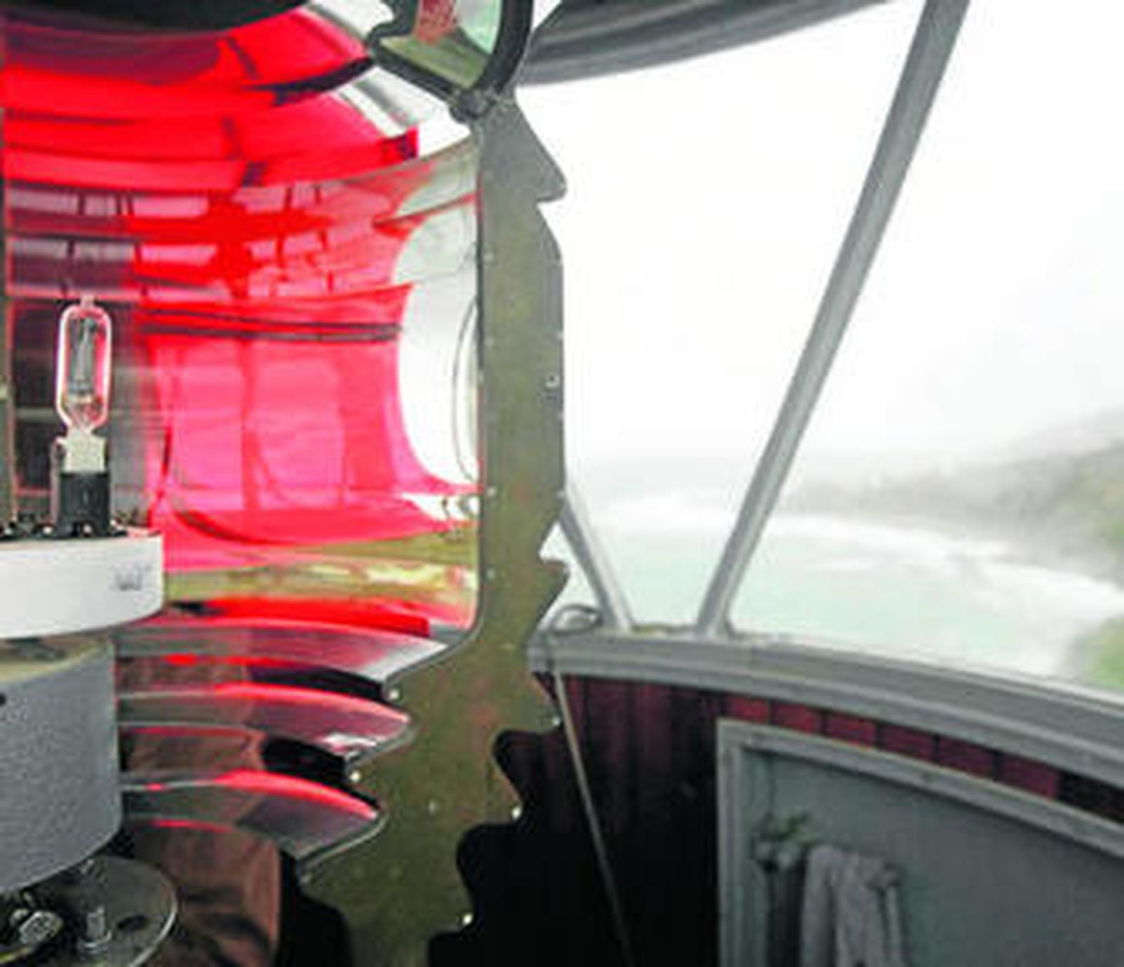 Para acceder al epicentro del faro, a su linterna, hay que atravesar un patio interno que conduce a unas estrechas escaleras de caracol. Es como subir al torreón de un castillo. Tras ella, una escala de metal nos lleva hasta la bombilla alógena de mil vatios con la que, cada noche, extiende su largo manto de luz blanca en 360 grados. El destello puede observarse desde 16 millas náuticas. La luz la enciende un reloj astronómico. Todo ello, a 19 metros de altura, que llegan a ser 42 si se mide ésta desde el nivel del mar. El sistema de cristales se completa con una pantalla roja, que sirve para señalar el bajo de la Perla. En este caso, el alcance de la luz es de 30 kilómetros.
