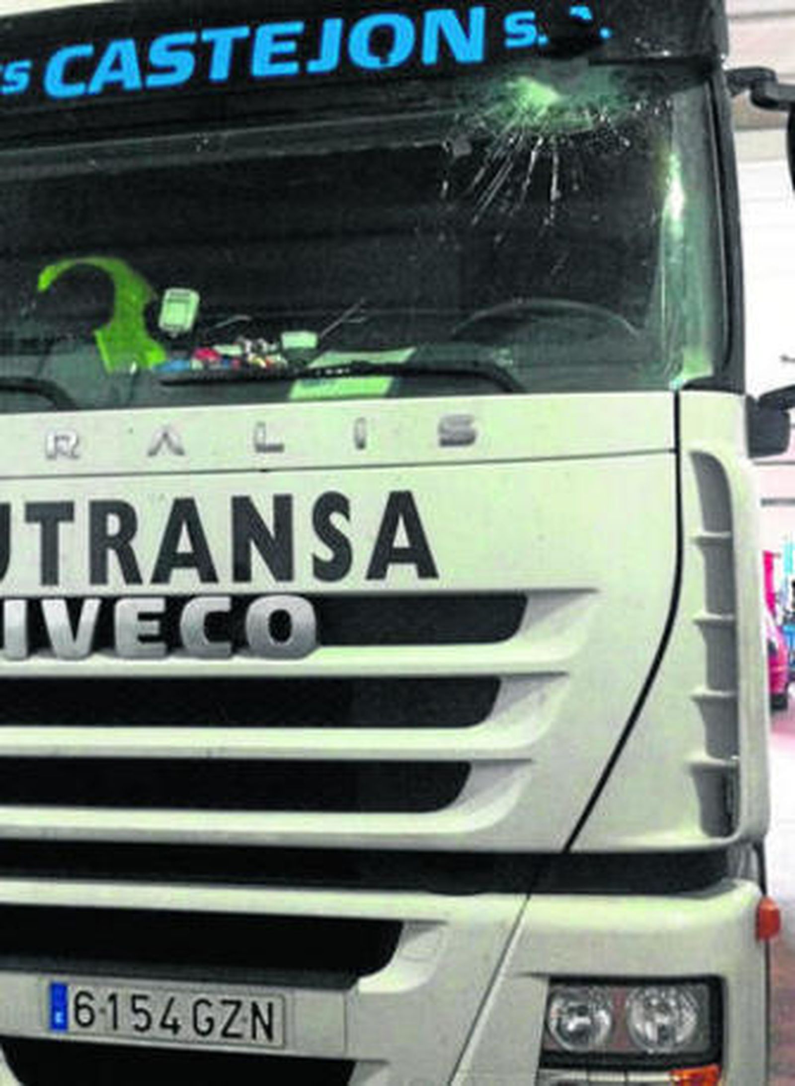 Se trata de un nuevo ataque ocurrido en la zona de El Saladillo. El impacto se produce en la luna delantera, lo que provoca que salten cristales en los ojos del camionero