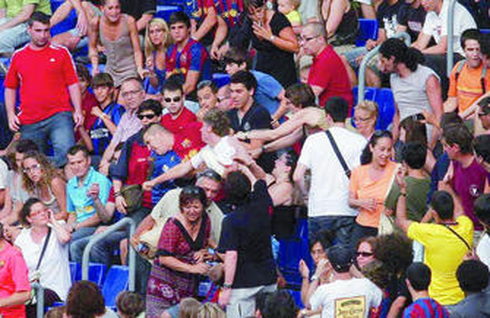 Ya se sabe que indeseables los hay en todos los sitios, incluso en las mejores familias. La foto de hoy ilustra a varios energúmenos que, en la presentación del nuevo jugador del Barcelona Ibramovich, se dedicaron a agredir a un joven que lucía un polo blanco y en sus ribetes la bandera española. Los extremistas intentaron quitarle la prenda y además causaron una gran alarma. Nuestro fotógrafo estuvo allí.