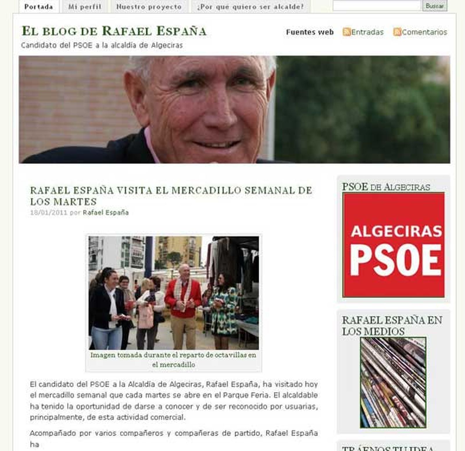 "Esta mañana he activado mi blog. En él encontraréis toda la información de nuestro proyecto y mi día a día en la actividad política. Os dejo el enlace. Espero que os guste y hacerlo vuestro". Con un mensaje así de escueto, el candidato del PSOE a la Alcaldía de Algeciras, Rafael España, anunciaba ayer en su perfil de Facebook el inicio de su nueva andadura en la red. La apertura de una bitácora que completa el hasta ahora repoker virtual con el que opta el socialista a las próximas elecciones municipales -que se celebrarán en mayo-. El septuagenario alcaldable se encuentra ya presente en seis plataforma digitales de la web: la popular red social Facebook, el espacio de microblogging denominado Twitter, Flickr (para compartir fotos), Youtube y Vodpod (estos dos últimos para vídeos).