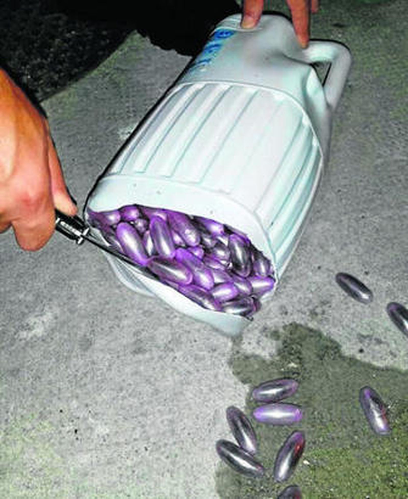 Los guardias civiles de la Compañía Fiscal inspeccionaron un turismo ocupado por dos personas, hallando en el maletero tres garrafas en el interior de una bolsa. Al abrir las garrafas vieron la primera capa llena de aceitunas, pero al agitarlas las bellotas de hachís que estaban en el fondo subieron. Al proceder al vaciado de las mismas comprobaron cómo efectivamente los envases estaban llenos de aceitunas y las mencionadas bellotas de hachís.