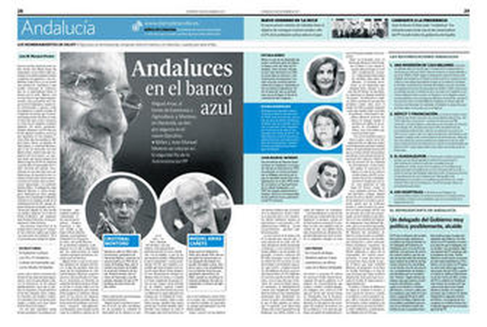 El pasado domingo, este periódico publicó un reportaje -en la imagen adjunta- sobre los andaluces que estarían en el banco azul con Mariano Rajoy. Los nombres de Montoro y de Arias se daban por seguros, como el de Báñez, un valor en alza -comentó un dirigente del PP andaluz- del que no se podía descartar que, finalmente, fuera ministra. Mariano Rajoy ha guardado un absoluto e inédito mutismo sobre la composición de su Gobierno, pero bien es cierto que las fuentes del PP andaluz acertaron, posiblemente la principal prueba de la sintonía de Arenas con el presidente, y adelanto de la mano que ahora le deberá echar el líder nacional si quiere que su partido también gane en Andalucía.