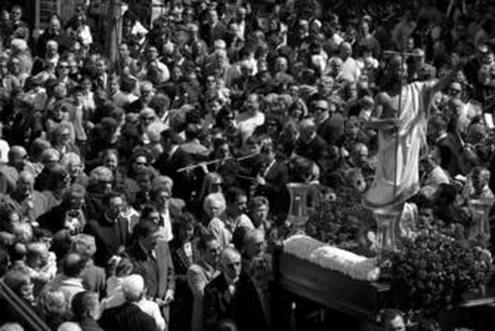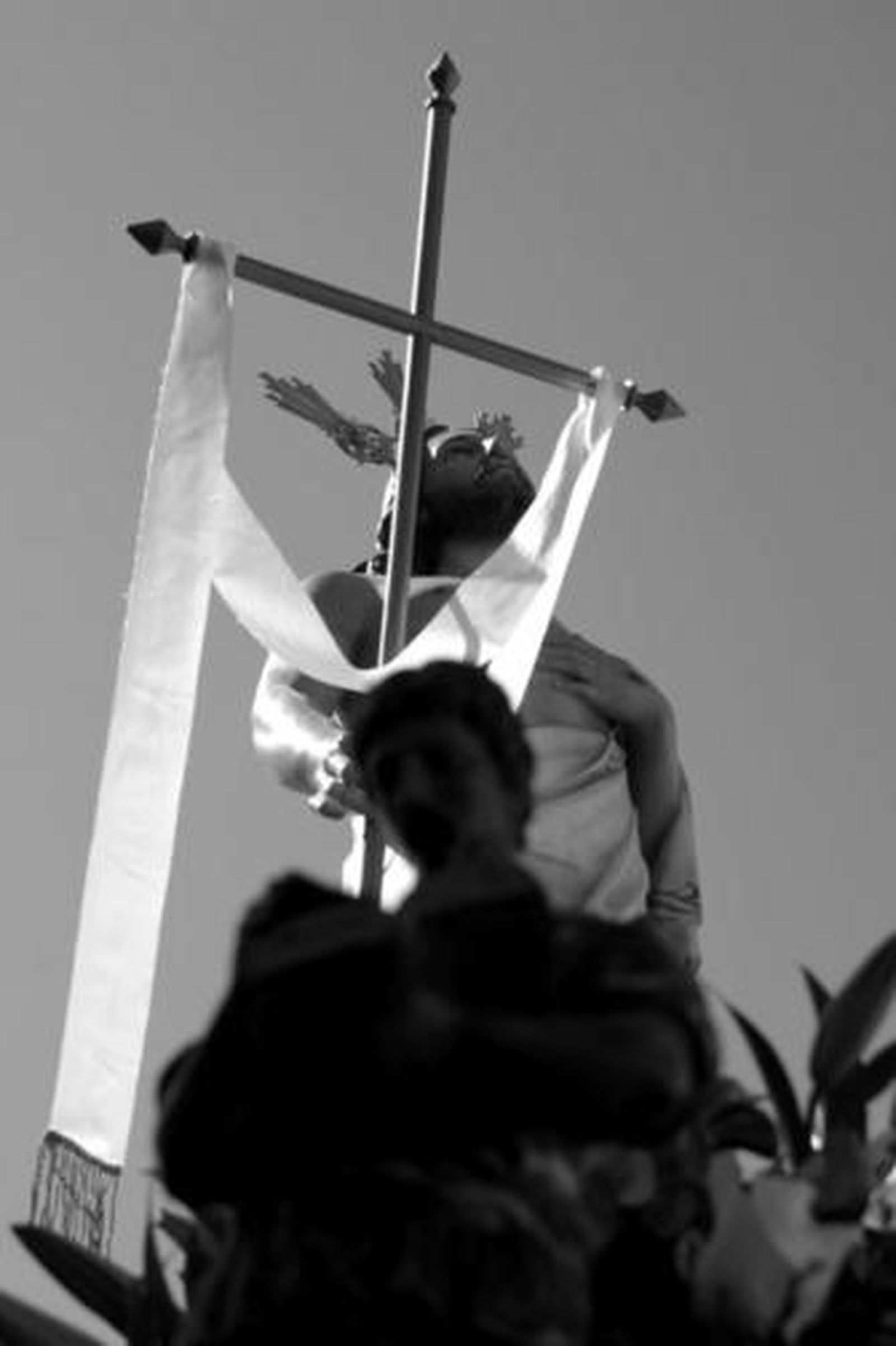 Puntual, el Cristo Resucitado, tallado en los talleres de Olot y donada por José Lara, se elevó hacia el cielo. Su fina figura fue mecida por los costaleros y por el viento. Su mirada dirigida hacia arriba invitaba al optimismo y a la alegría. Reflejaba la resurrección. Era un día para estar contentos después del Viernes de Dolores.