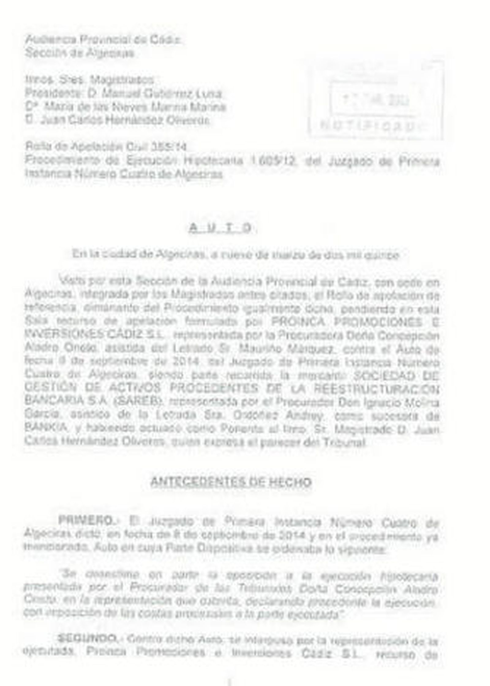 La Audiencia Provincial de Cádiz, en un auto fechado el 9 de marzo del presente año, "tras rechazar las alegaciones del banco interesando la inadmisión del recurso de apelación y entrando en el fondo del asunto, revoca el auto del Juzgado de Instancia y estima la oposición, ordenando el sobreseimiento del procedimiento de ejecución hipotecaria, con condena en costas al banco ejecutante en la instancia".
