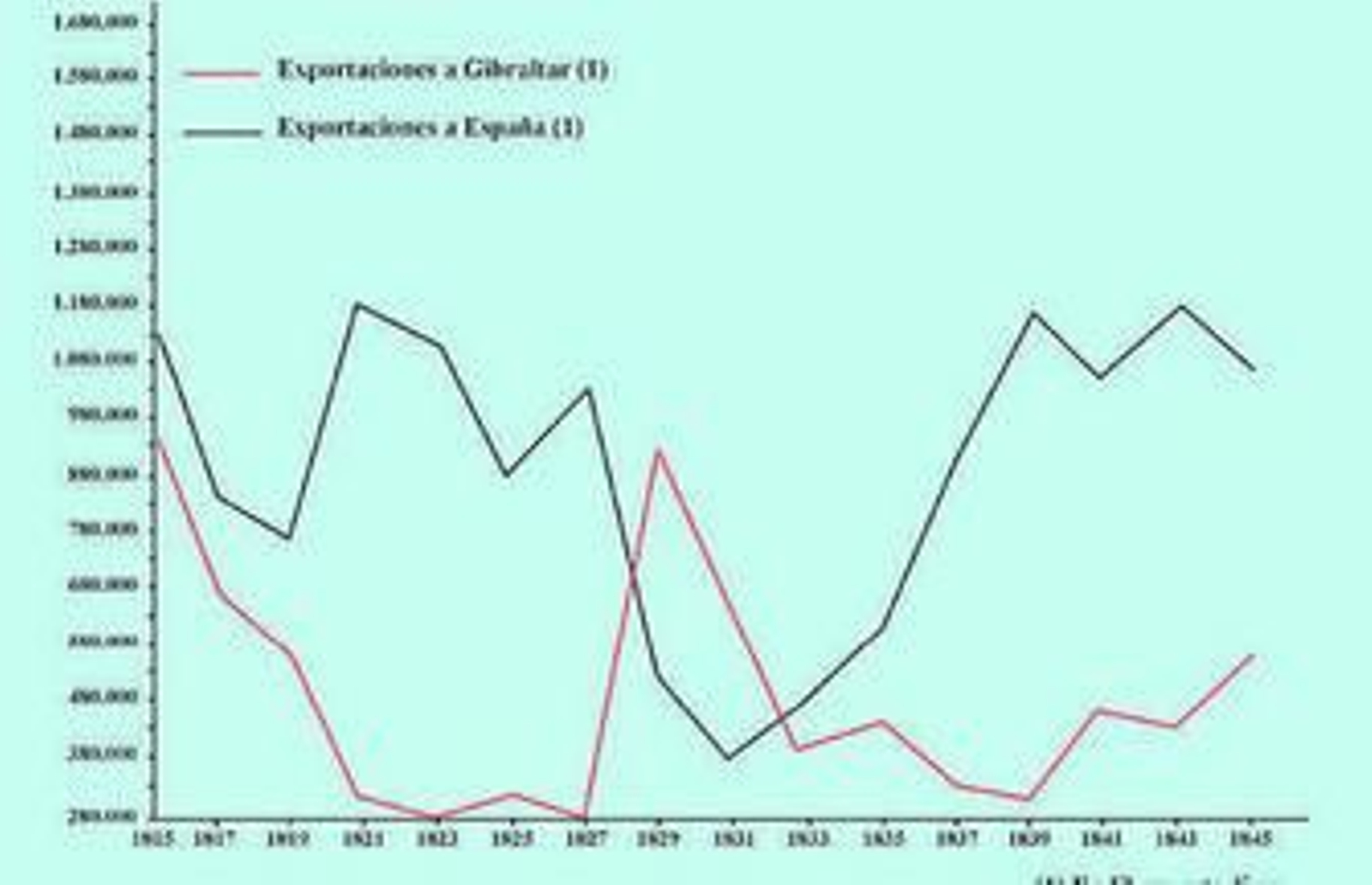 El militar Rochfort Scott, que vivió en Gibraltar formando parte de la guarnición entre 1822 y 1830, señala que la cantidad de algodón que Gran Bretaña envía a Gibraltar anualmente alcanza el valor de medio millón de libras esterlinas, cifra que era muy superior a la producida por la exportación a todos los demás puertos españoles que ascendía a trece mil libras.