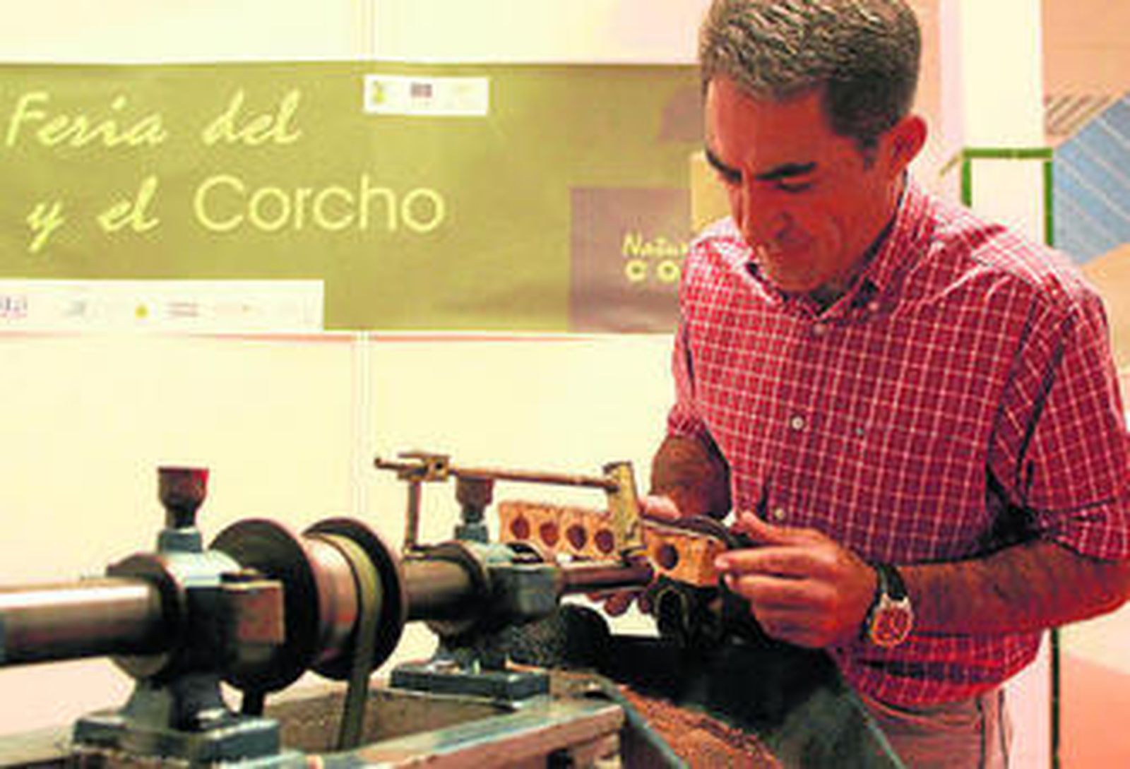 Emilio Pérez Ríos tiene claro que el tapón de corcho es la razón de ser de todo un entramado laboral y económico en torno a un producto sostenible y con un grado de aprovechamiento máximo. Pérez Ríos, que trabaja para el Grupo de Desarrollo Rural Los Alcornocales (GDR), participa hasta hoy en la Feria del Corcho y el Vino que se celebra en el pabellón del recinto ferial de Los Barrios. Su labor consiste en fabricar tapones a los ojos de los visitantes con un torno y dar toda la información sobre este producto.