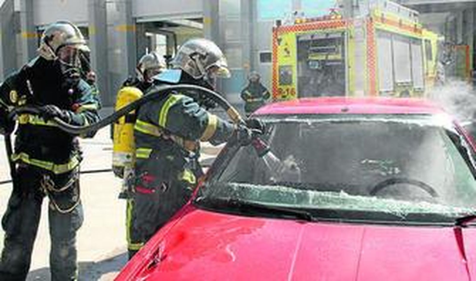 Otro de los simulacros que van a realizar es la extinción de un incendio en un vehículo. En este caso "no hay víctimas y no hay que hacer rescate", añade García. La autobomba está preparada y de ella se extrae una línea de manguera.