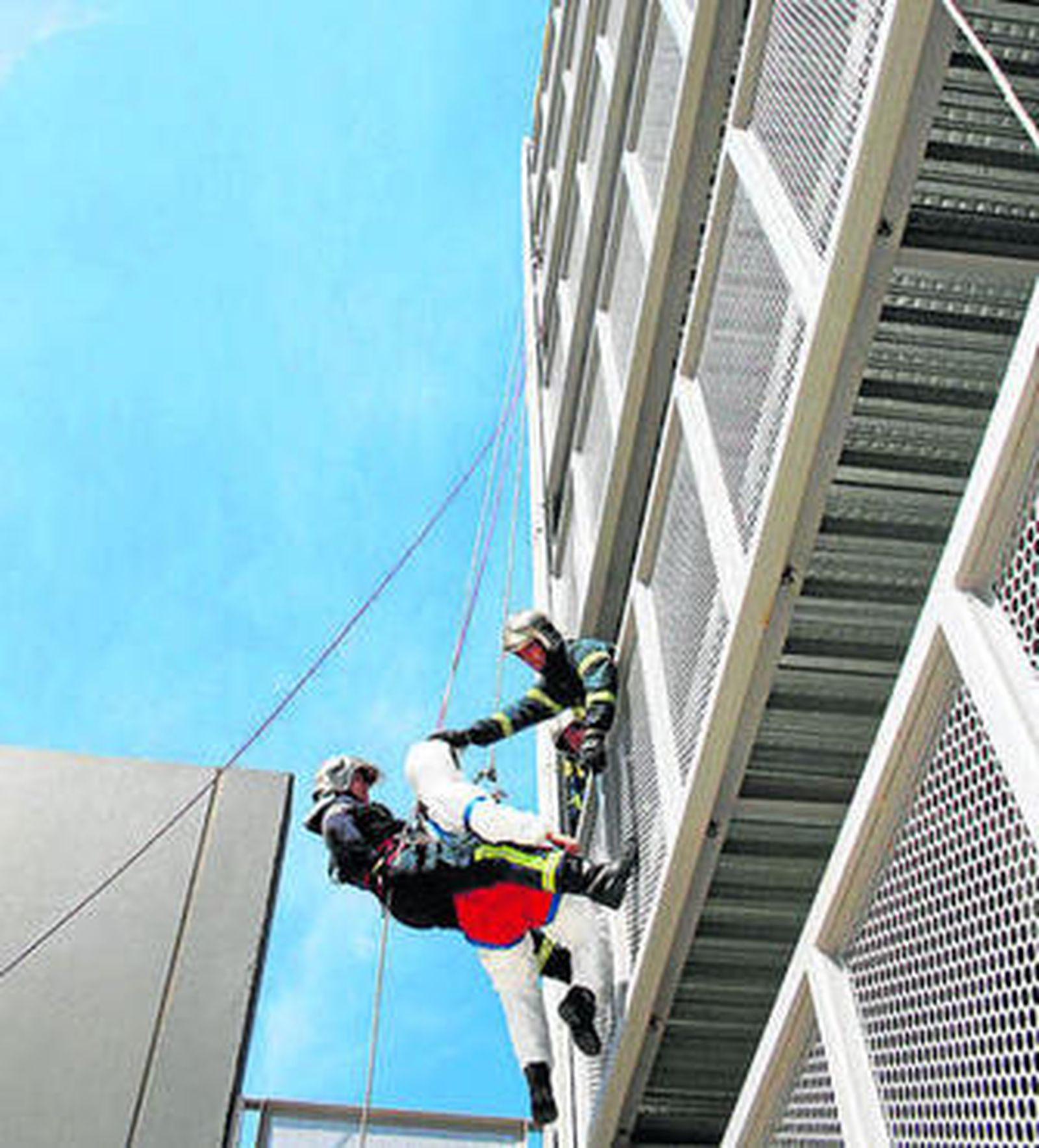 Fernando Rodríguez se ha subido a una cuarta planta y con la colaboración de sus compañeros va a descender un piso por la fachada, enganchado mediante un sistema de polea con una cuerda y su arnés correspondiente. Lleva un descendedor que llaman STOP. Cuando llega a la planta donde está la persona que debe ser rescatada, y que no está inmovilizada, la engancha mediante un triángulo de rescate. Una vez sujeta, ambos descienden hasta el nivel cero.