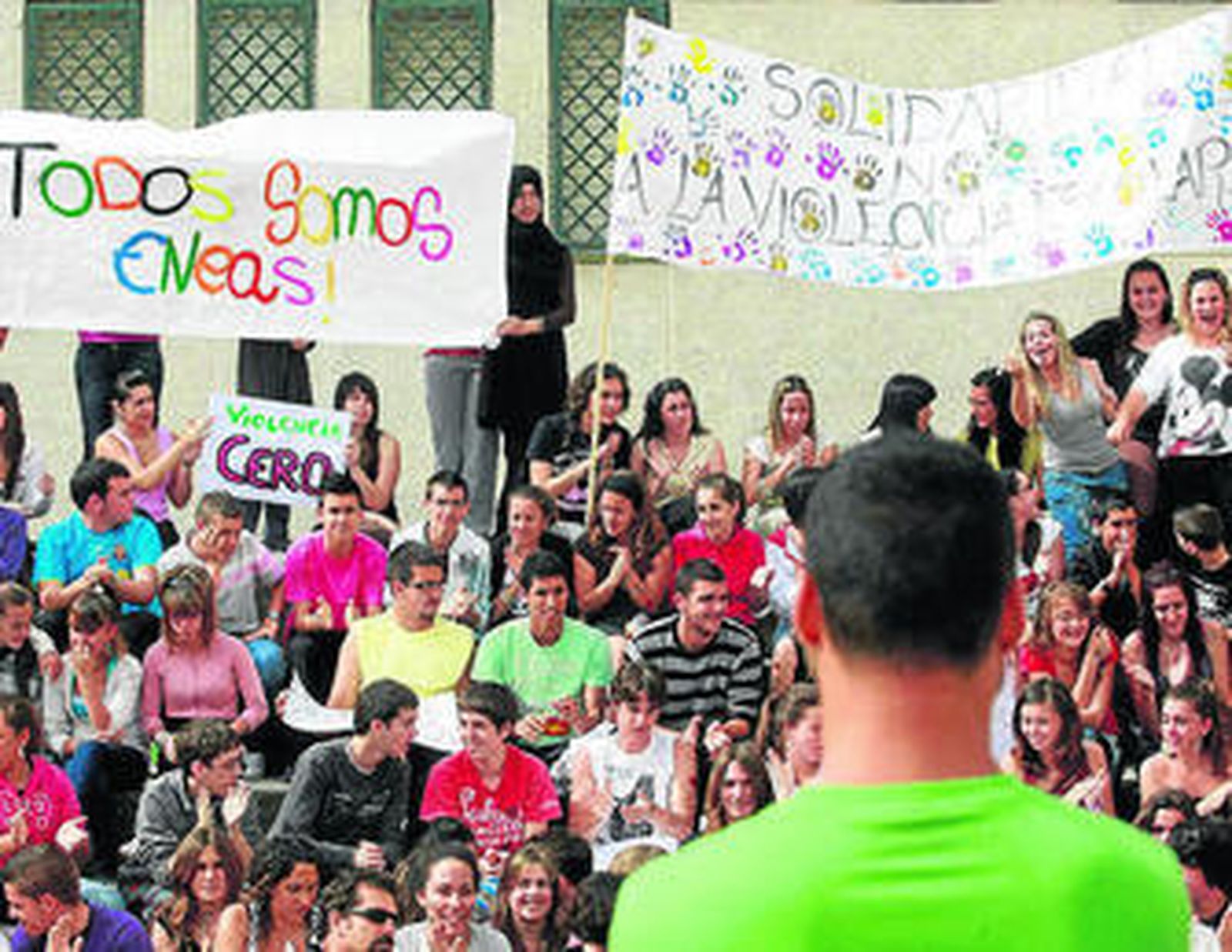 El IES Saladillo respiró ayer un clima controvertido que desviaba la atención, por momentos, aunque sostenía un lema claro: el rechazo a la violencia escolar. Eran las once de la mañana cuando profesores y alumnado se acercaron al patio. Éstos últimos elevaron pancartas donde se leía Si te pasa a ti nos pasa a todos, aunque otros mensajes eran más directos: ¿Por qué se va el agredido, no el agresor?.