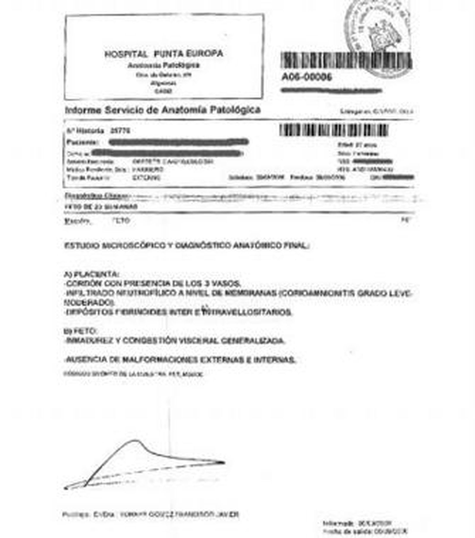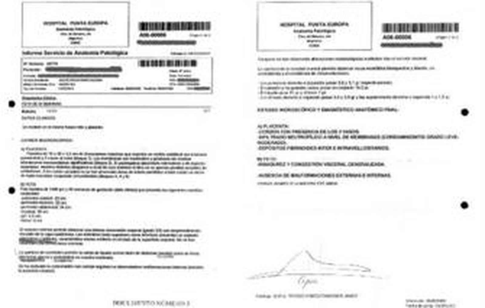 El informe original elaborado por un patólogo del hospital algecireño era de dos páginas. En la primera se exponían las conclusiones de un examen macroscópico que se le practicó al feto y la segunda revelaba los resultados del estudio de carácter microscópico. A los padres del nonato sólo le entregaron -se desconoce aún quién y con qué fines- una sola página escrita por una cara que sólo reflejaba el análisis microscópico y cuya cabecera fue falseada. Este examen describía que el feto no presentaba anomalías y llevó a los padres a creer que el aborto practicado a la madre no era necesario y por eso lo denunciaron posteriormente. Si embargo, el examen macroscópico -que no fue aportado a la familia- determinó que los miembros superiores e inferiores del feto presentaban un aspecto edematoso y brillante y la apertura de las cavidades permitía la salida de líquido seroso tanto del abdomen (ascitis) como del tórax (derrames pleural y pericárdico) en cuantía moderada. Esta descripción coincide con el diagnóstico de hidrops fetal no inmune idiopático que le fue comunicado a la familia para que decidiera si interrumpía el embarazo.
