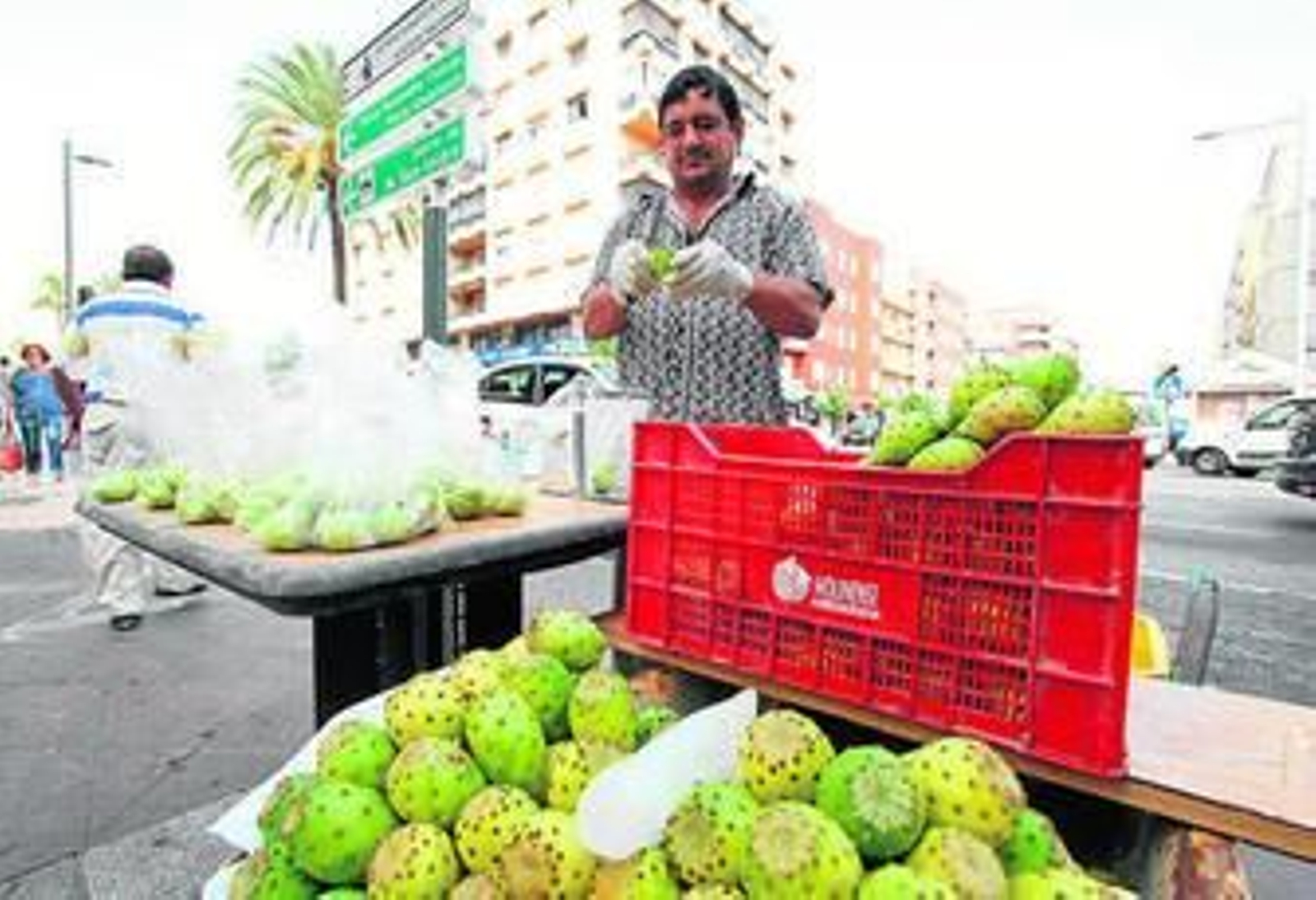 Vendedor Manuel lleva cuatro años vendiendo todo tipo de frutas y hortalizas en su puesto. Este verano, está teniendo éxito con el higo chumbo, que recoge con su hermano, con el que, dice, "voy a medias".