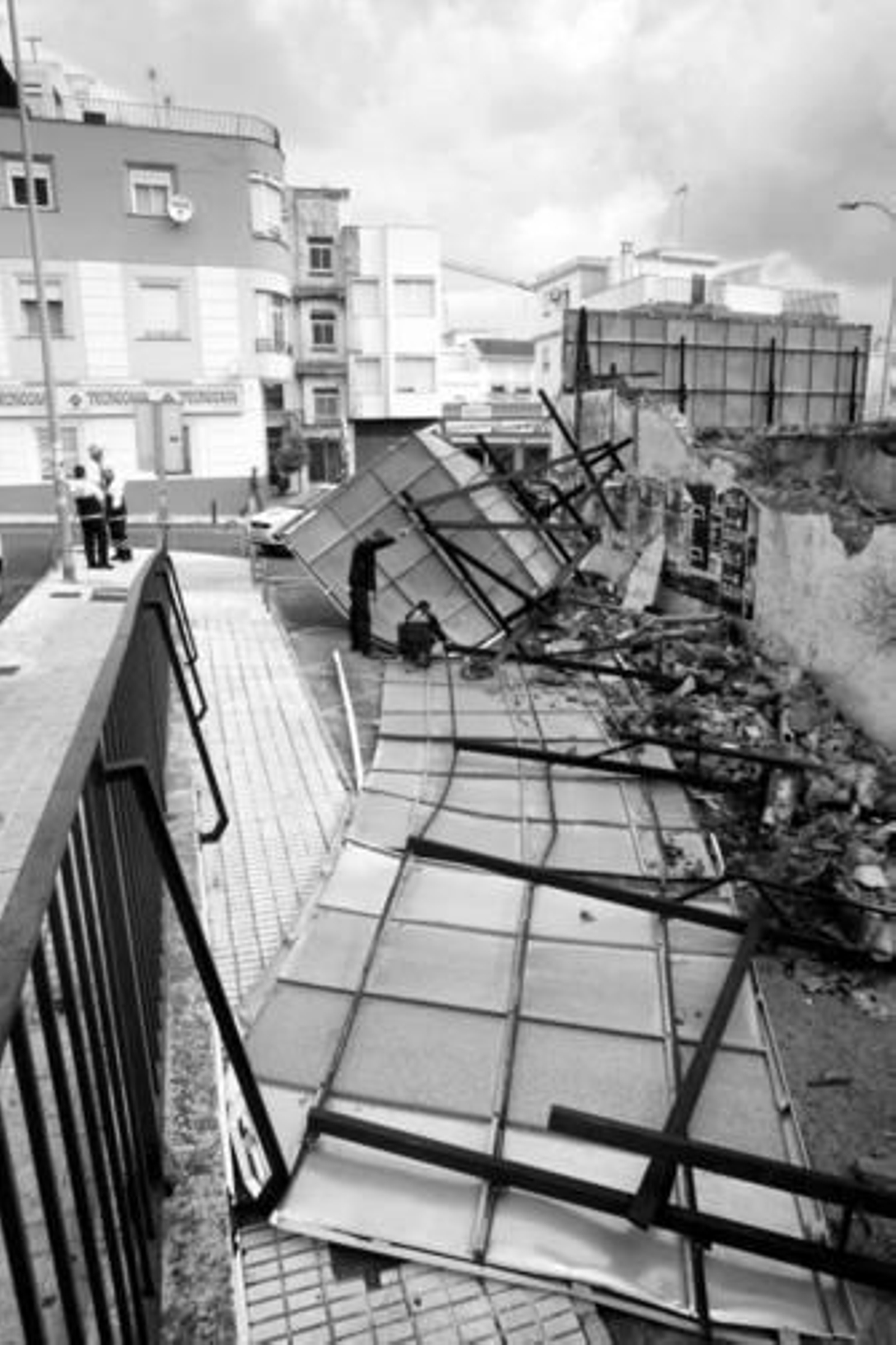 En el parking del centro cívico de La Reconquista los efectivos tuvieron que actuar al caerse el techo de uralita, lo que afectó a siete coches. Uno de ellos quedó destrozado. Por otra parte, la rotonda de la avenida Fuerzas Armadas permaneció un tiempo cortada al tráfico ante el más que evidente riesgo de derrumbe de una farola que se ubica en las inmediaciones.