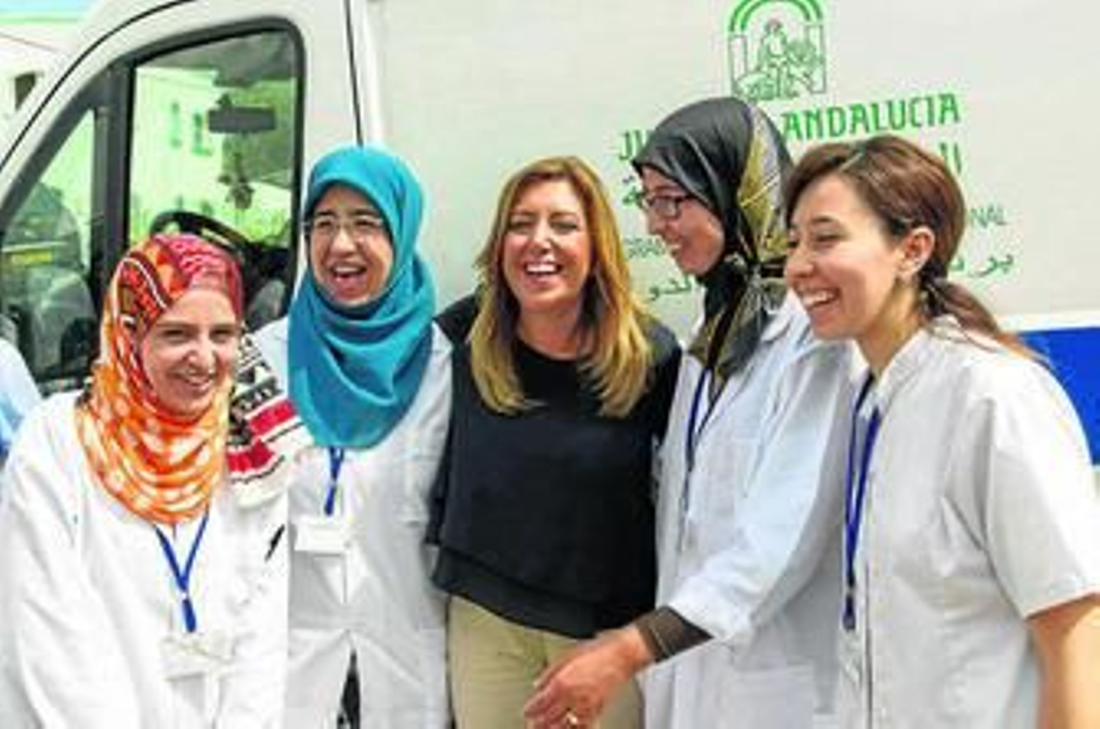 En Jebel Labhib, una comuna rural de la provincia de Tetuán, la Junta ha construido uno de los 22 centros de salud maternoinfantiles que ha financiado en el norte de Marruecos. En esta población, situada en las estribaciones del Rif, la mayor parte de las calles no están asfaltadas. El centro costó 80.000 euros, y el personal se formó en la Escuela de Salud Pública de Granada. Díaz visitó este ambulatorio que atiende a una media de 12 partos al mes. Antes de su construcción, las mujeres que iban a parir tenían que desplazarse hasta Tetuán, a una hora de carretera. La mayoría, no obstante, daba a luz en sus casas. Con tres matronas en plantilla, la dirección ha conseguido aumentar un 50% el número de mujeres que se someten a un control médico antes y después del parto. En la zona norte, la Junta ha construido 22 centros como éste, cuatro de ellos en la ciudad de Tetuán. Para atenderlos, disponen de 18 ambulancias que también han sido costeadas por la Junta.