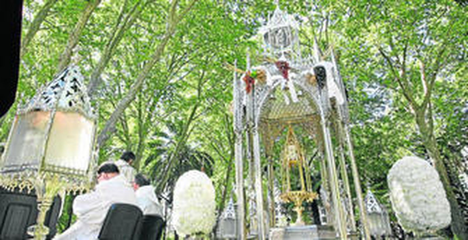 La cálida temperatura, el sol, el ambiente y el escenario, todo acompañaba ayer para la celebración de la procesión del Corpus Christi. El parque María Cristina volvió a convertirse en un paraje idílico para la celebración de la homilía que antecede al desfile. El arcipreste de la zona centro-norte, Juan José Marina, ofició la misa ante alrededor de 400 personas que colmaban la calle central de este pulmón verde de la ciudad. "Hoy el Señor sale a sus calles y plazas para que seamos testigos del amor y su entrega".