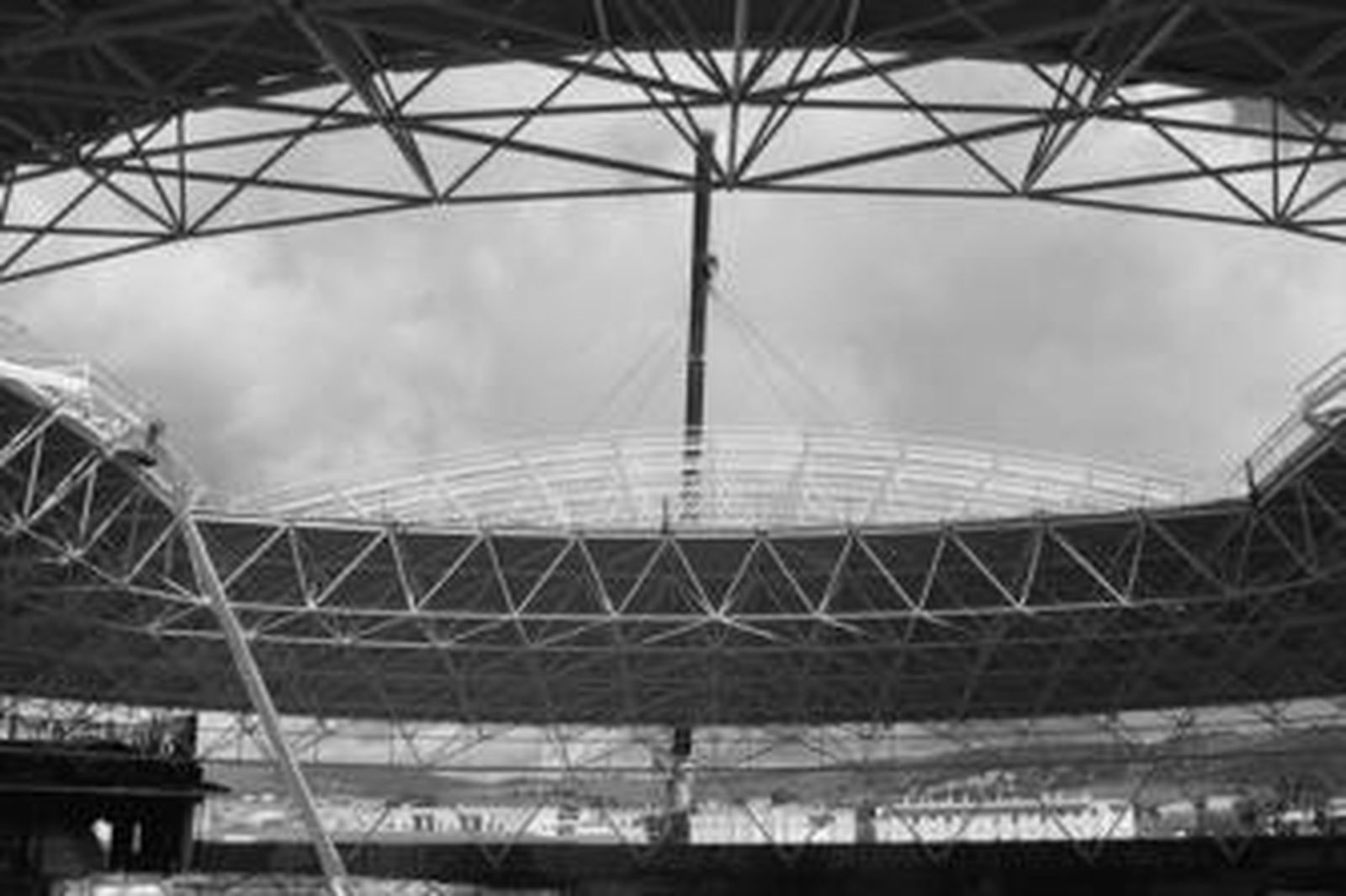 Los trabajos están consistiendo en la colocación del primero de los dos párpados retráctiles que servirán de cerramiento superior del coso en forma de cúpula. Para ello se está utilizando una grúa de gran tonelaje que desde el exterior del recinto eleva y encaja en su lugar cada una de las dos grandes piezas.