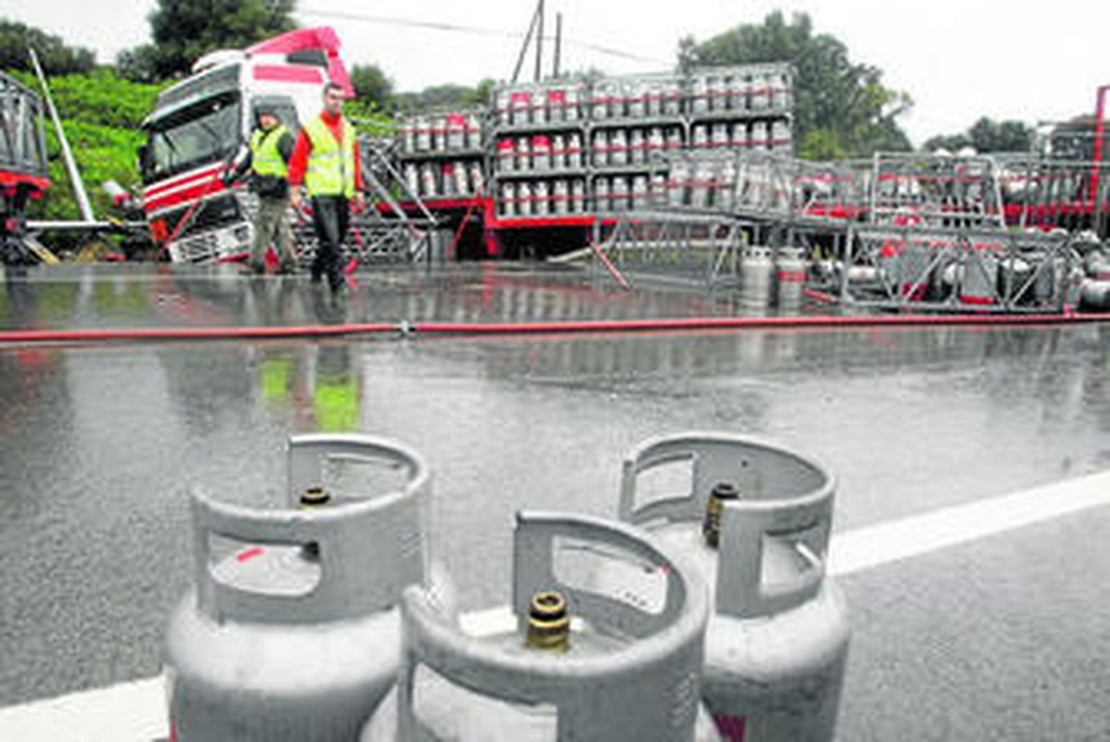 El concejal de Seguridad Ciudadana de San Roque, José Luis Navarro Sampalo, informó que el camión circulaba por la carretera sentido a La Línea en el tramo situado entre El Toril y la gasolinera de Las Rosas cuando se produjo el accidente. "Como se trata de una bajada pronunciada y también hay una importante curva, lo más probable es que debido a la intensa lluvia el conductor haya perdido el control del vehículo. El camión hizo una cruceta, ha caído hacia el lado derecho del arcén, y las bombonas se han diseminado por la carretera", explicó. El edil indicó que la situación estuvo en todo momento controlada por los bomberos. Las bombonas fueron cargadas de nuevo en camiones pequeños. "La Guardia Civil montó todo el dispositivo de tráfico y nuestra Policía Local también acudió para ayudar si hubiera hecho falta". Finalmente, Navarro Sampalo hizo un llamamiento a la prudencia al volante. "En cualquier momento puede ocurrir un accidente, pero con este tiempo de lluvia intensa es mucho más probable. Pido a todos que sean conscientes del peligro y que circulen con precaución y a la velocidad adecuada".