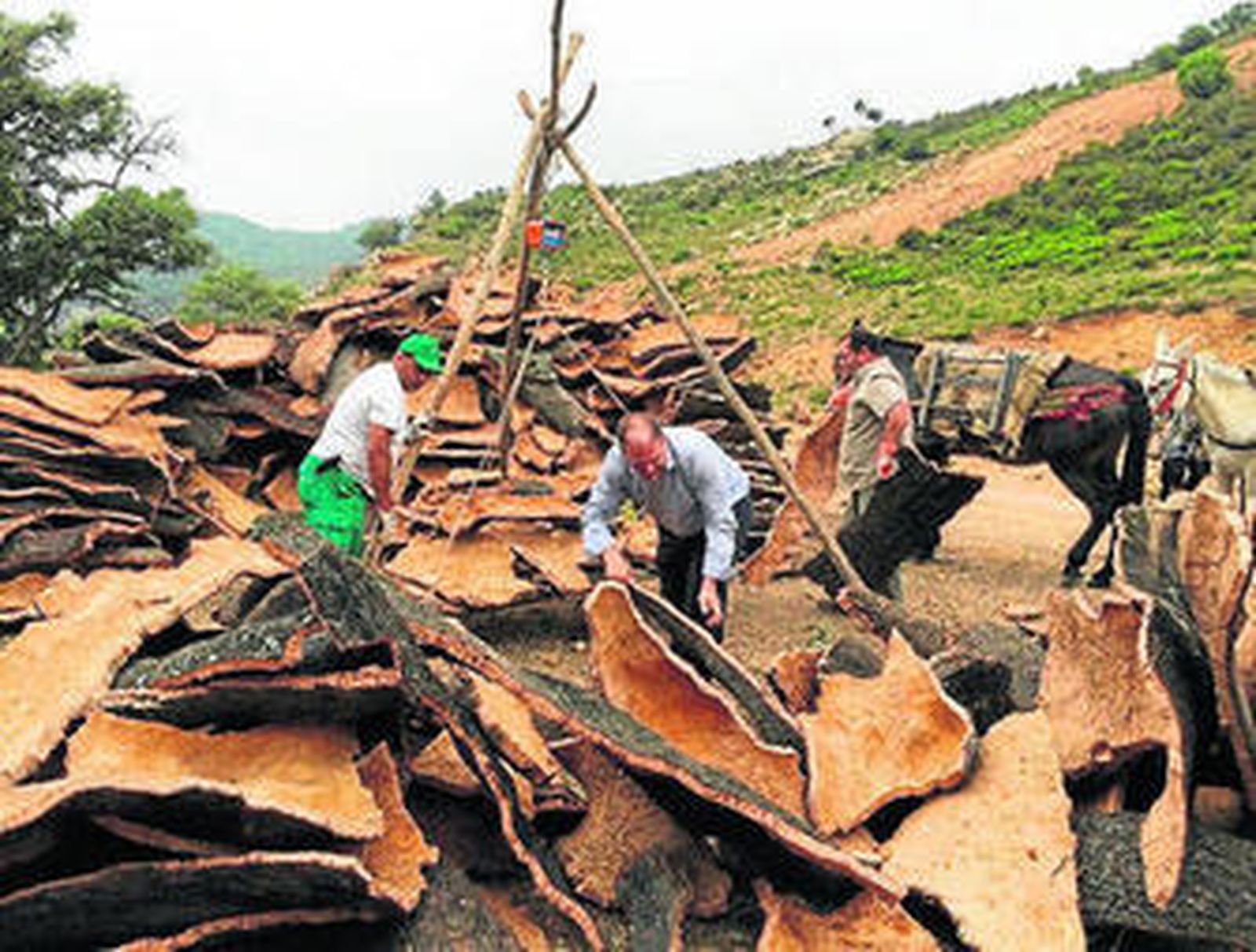 Romero también compartió unos minutos con una cuadrilla de trabajadores donde no han faltado los hachas, los arrecogedores, los arrieros y los mulos. El corchero extrae la corteza, que el recogedor carga sobre el mulo, conducido a su vez por los arrieros. Los pesadores recuentan y apilan las placas en el patio de corchas. Ese es el proceso artesanal y donde la dureza de esta labor se agrava al tener forzosamente que producirse en época estival, que es cuando el árbol únicamente permite quitarse la corteza, periodo coincidente con la mayor actividad vital del alcornoque por causa de las temperaturas reinantes.