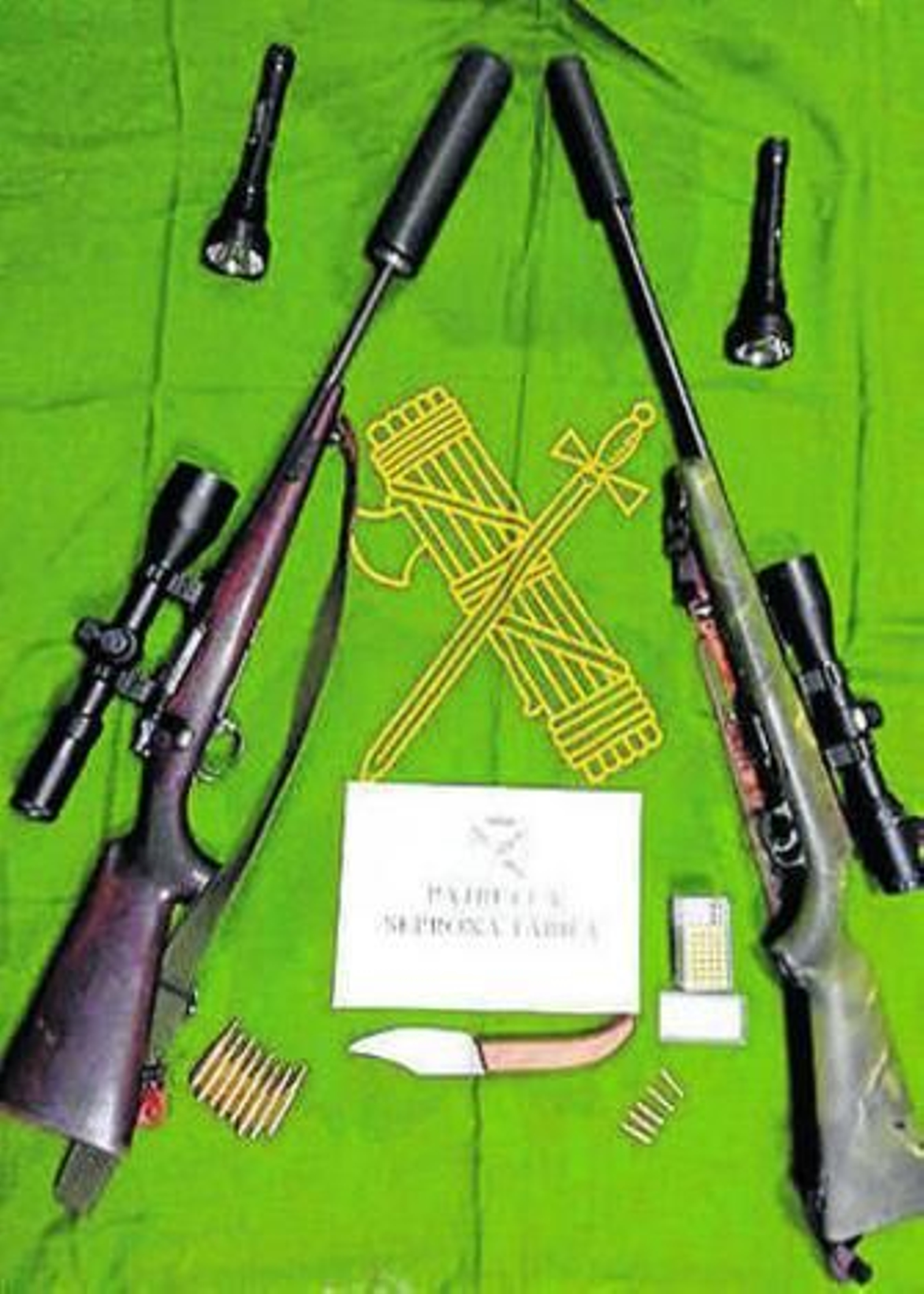La Guardia Civil intervino las armas, la munición, los silenciadores y focos de gran potencia que hayaron en el vehículo. Todo fue puesto a disporsición de la Autoridad competente.