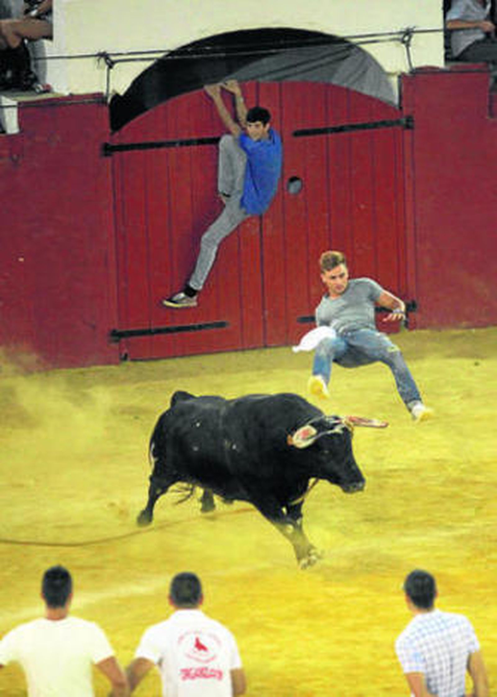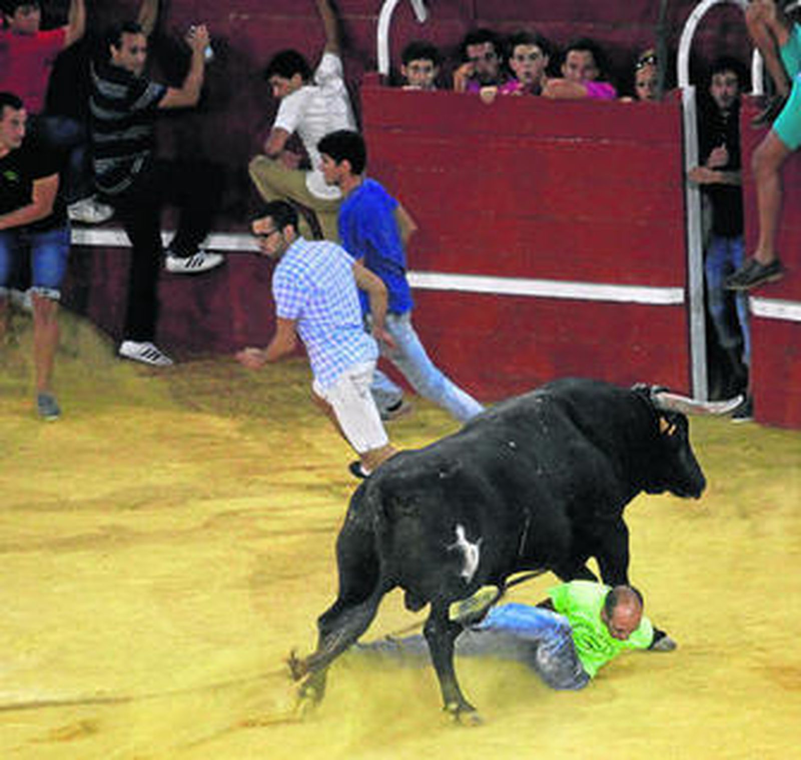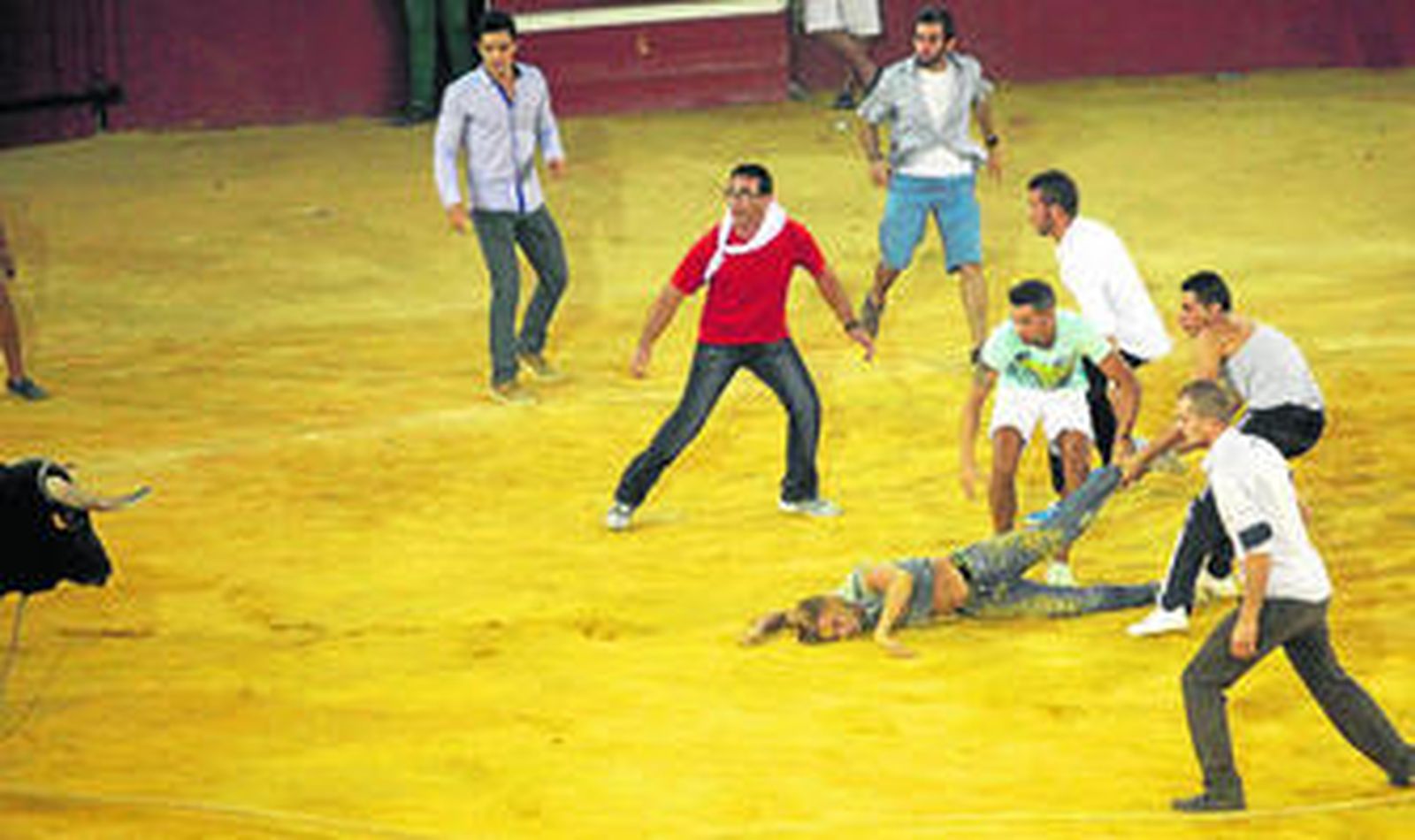 Una vez dentro, el toro se tomó con calma su cometido pero pasados unos minutos comenzó a embestir y a punto estuvo de arrollar a varios mozos. Algunos de ellos comenzaron a tirar de la soga y fueron avisados por la organización -que no permitió vejaciones al animal- y pitados por el público, que llenaban el tendido.