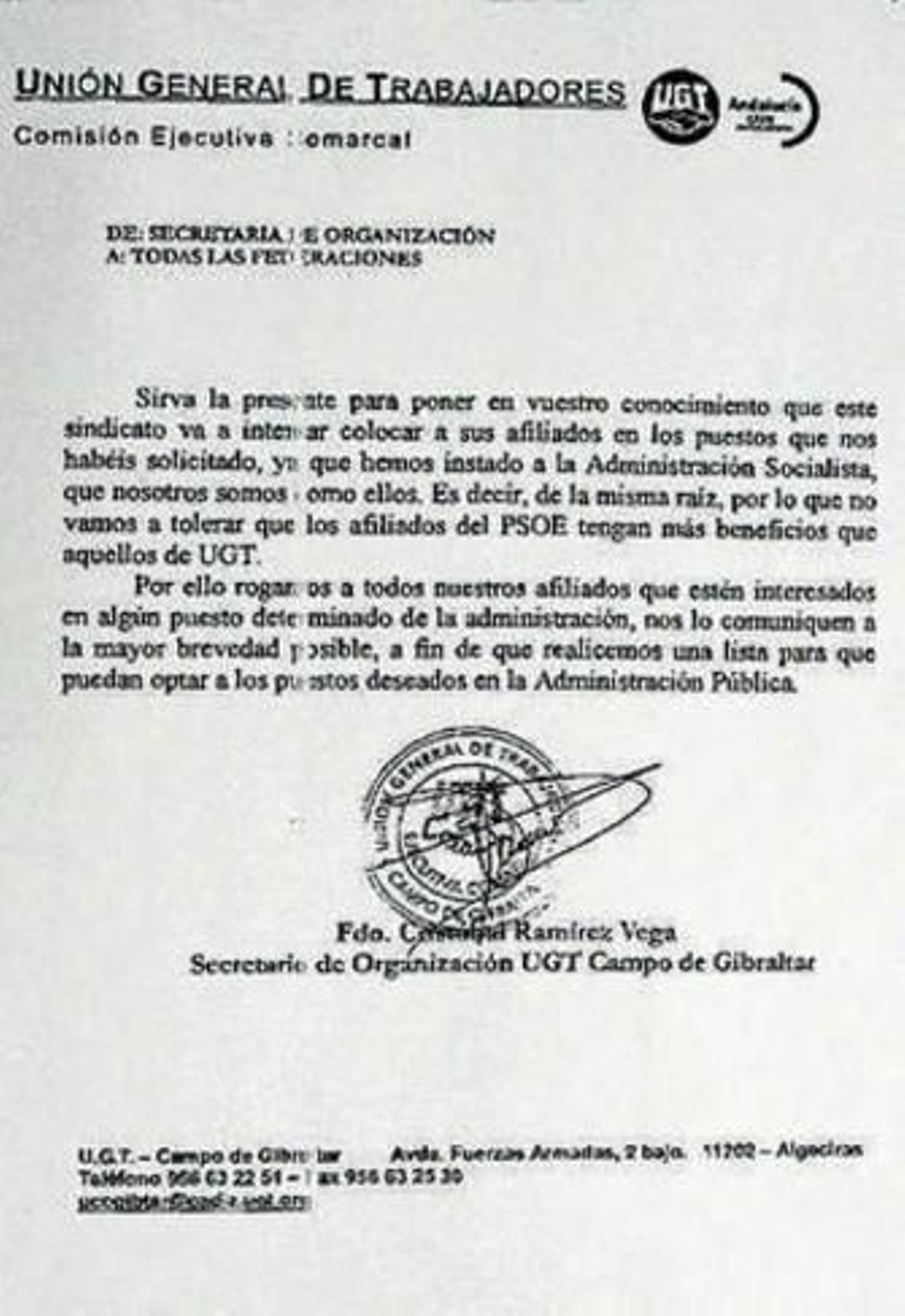 El sindicato UGT ha denunciado ante la Policía Nacional y la Guardia Civil la existencia de una circular donde el secretario de organización del Campo de Gibraltar, Cristóbal Ramírez, alude -según el documento- a la existencia de un acuerdo con el Partido Socialista para "enchufar" en la Junta a afiliados de la central obrera. La organización atribuye el documento a una falsificación con fines difamatorios y niega su autoría.
