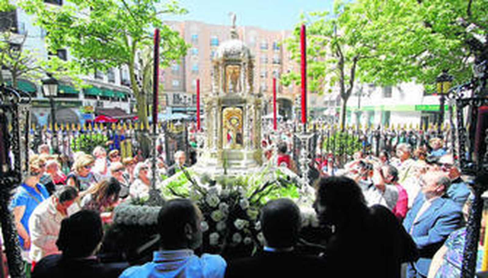 La Custodia Sacramental tardó algo más en pisar la calle. Pasado el mediodía, el incienso embriagaba la plaza cuando volvió a sonar el himno nacional y comenzaba a verse por la Custodia. Iba sobre unas andas carroza llevada a ruedas y decorada con hojas de esparraguera, claveles y gladiolos blancos.
