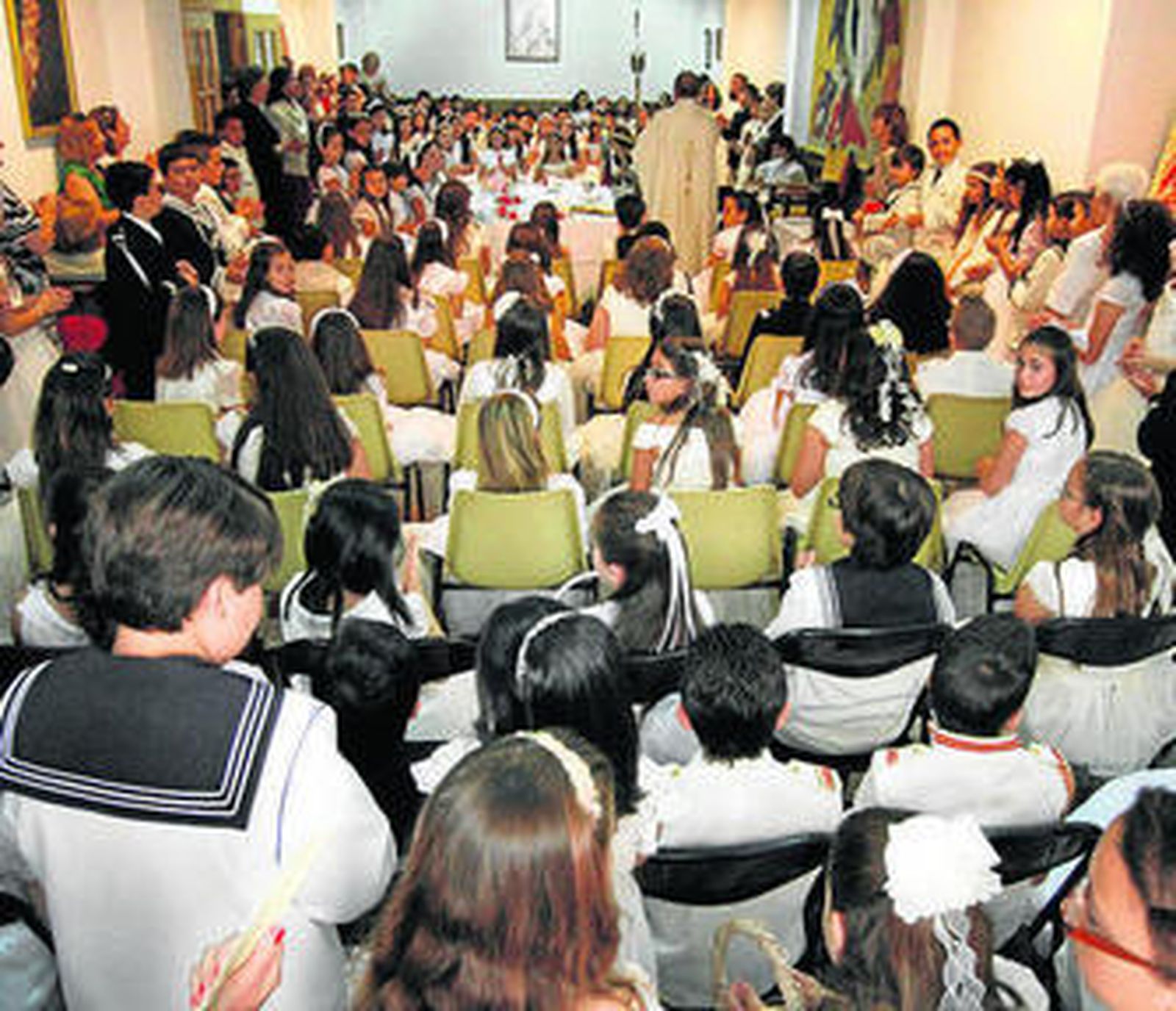 La parroquia estaba literalmente abarrotada para oír la misa concelebrada por todos los sacerdotes del Arciprestazgo de la ciudad. Muchos fueron también los niños que participaron en el festejo religioso y volvieron a ponerse sus trajes de Primera Comunión para asistir a la eucaristía infantil que tuvo lugar, como es tradición, en los salones parroquiales de la calle Sol. Una vez terminadas ambas misas, que se celebraron de manera simultánea, y pasadas las 11:30 comenzó a organizarse la comitiva. Poco antes, empezaban a oírse las bandas de música, la de Cornetas y Tambores de Santa Bárbara, que llegó tocando por la calle Real, y la Banda de Música Municipal de La Línea, que venía del otro lado, desde su local habitual de ensayos.