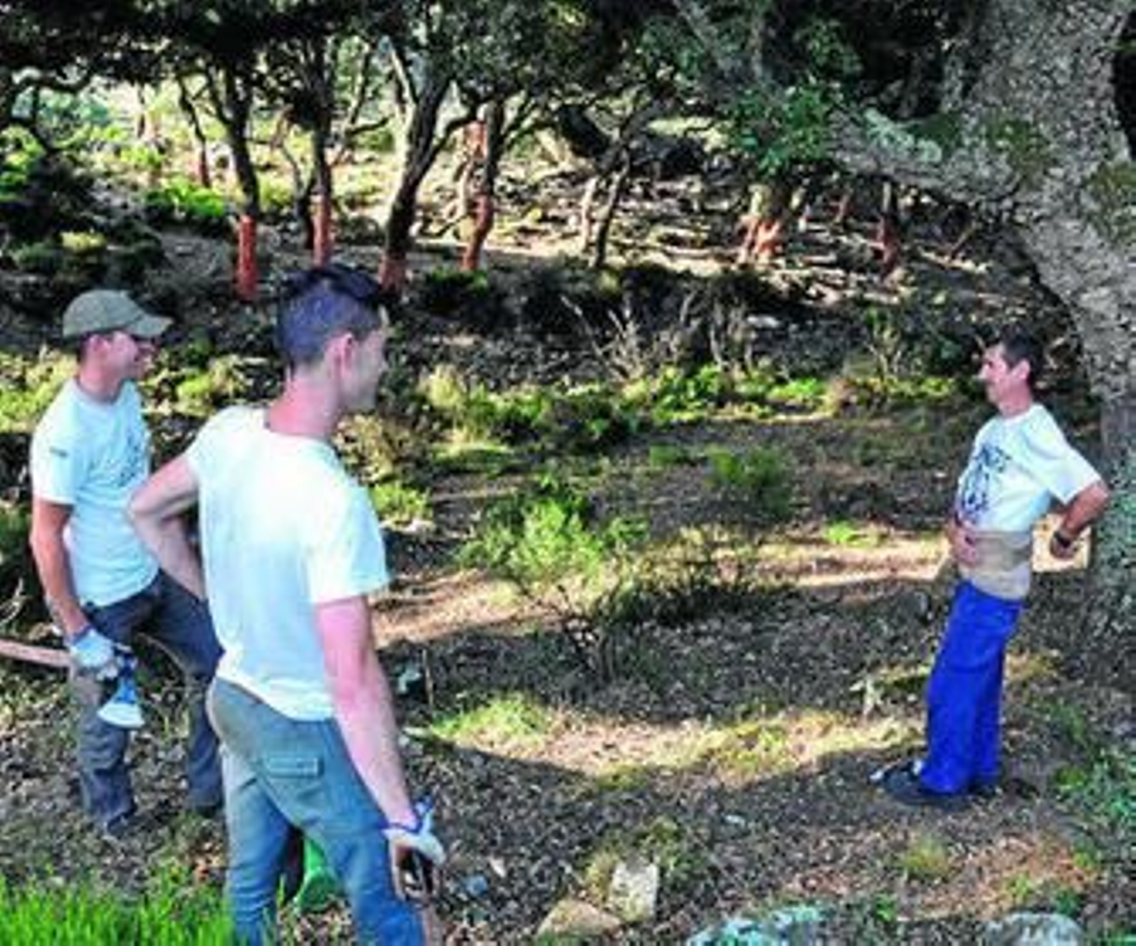 La cuadrilla de corcheros se traslada a diario a una superficie acotada del monte público. La zona extractiva ha sido fijada por los técnicos municipales a no muchos metros del patio, lugar destinado al acúmulo y pesaje.