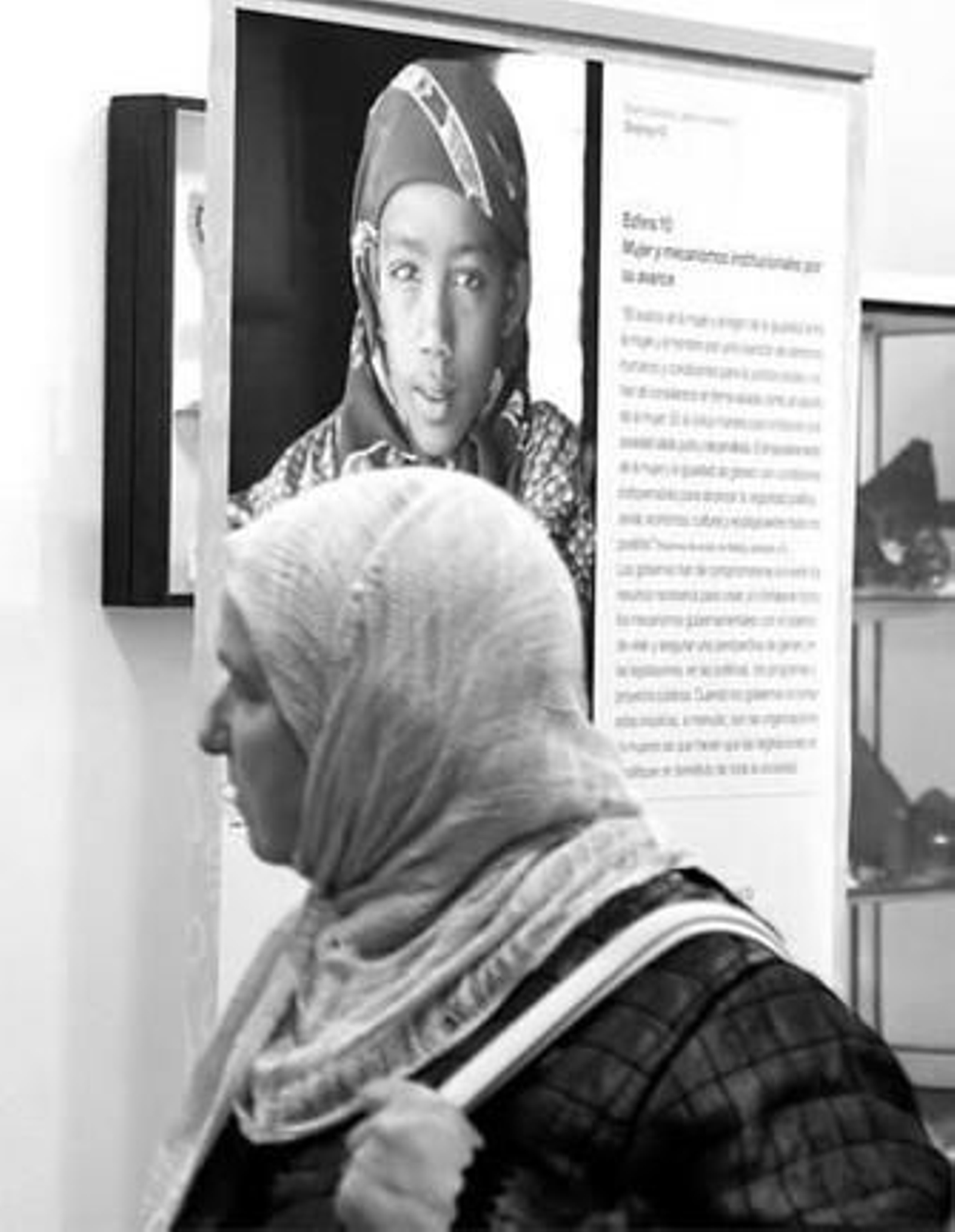 La muestra Mujer y pobreza ¿Relación perpetua? se compone de quince paneles explicativos con imágenes de mujeres de todo el mundo elaboradas por fotógrafos profesionales y miembros del colectivo social. Además de la imagen, los paneles recogen datos relativos a las distintas brechas entre sexos que, a día de hoy, siguen existiendo en todo el mundo. Torres puso varios ejemplos, como que el 70% de las personas que viven bajo el umbral de la pobreza, con menos de un dólar al día, son mujeres. También son mujeres más de la mitad de los analfabetos del mundo y el 80% de los refugiados por conflictos bélicos, principalmente acompañadas por niños.