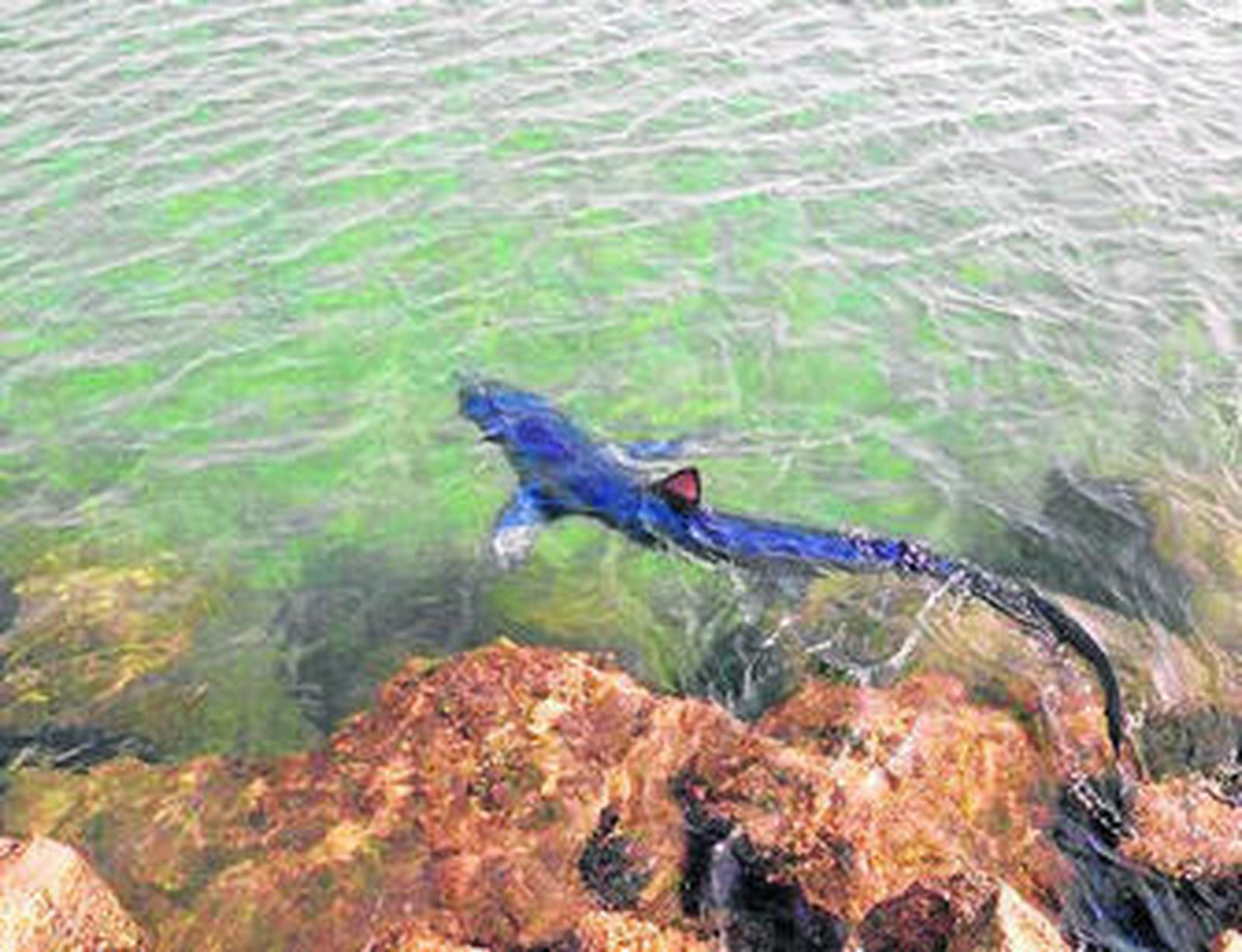 El animal, una especie considerada no peligrosa para los humanos, fue visto por primera vez sobre las 9:40 horas de la mañana muy cerca de la orilla, en la zona del espigón de Sotogrande. Medía, aproximadamente, dos metros de largo; nadaba desorientado entre las rocas y recorría la línea de costa entre los chiringuitos Bahía Limón y Chambao, según explicaron a este diario desde el servicio de emergencias 112. A las diez de la mañana, ya con la presencia del dispositivo de seguridad en la playa formado por la Policía Local, Guardia Civil (incluyendo agentes del Serpona) y Protección Civil, se izó la bandera roja -prohibición total del baño- que se mantuvo hasta las tres de la tarde.