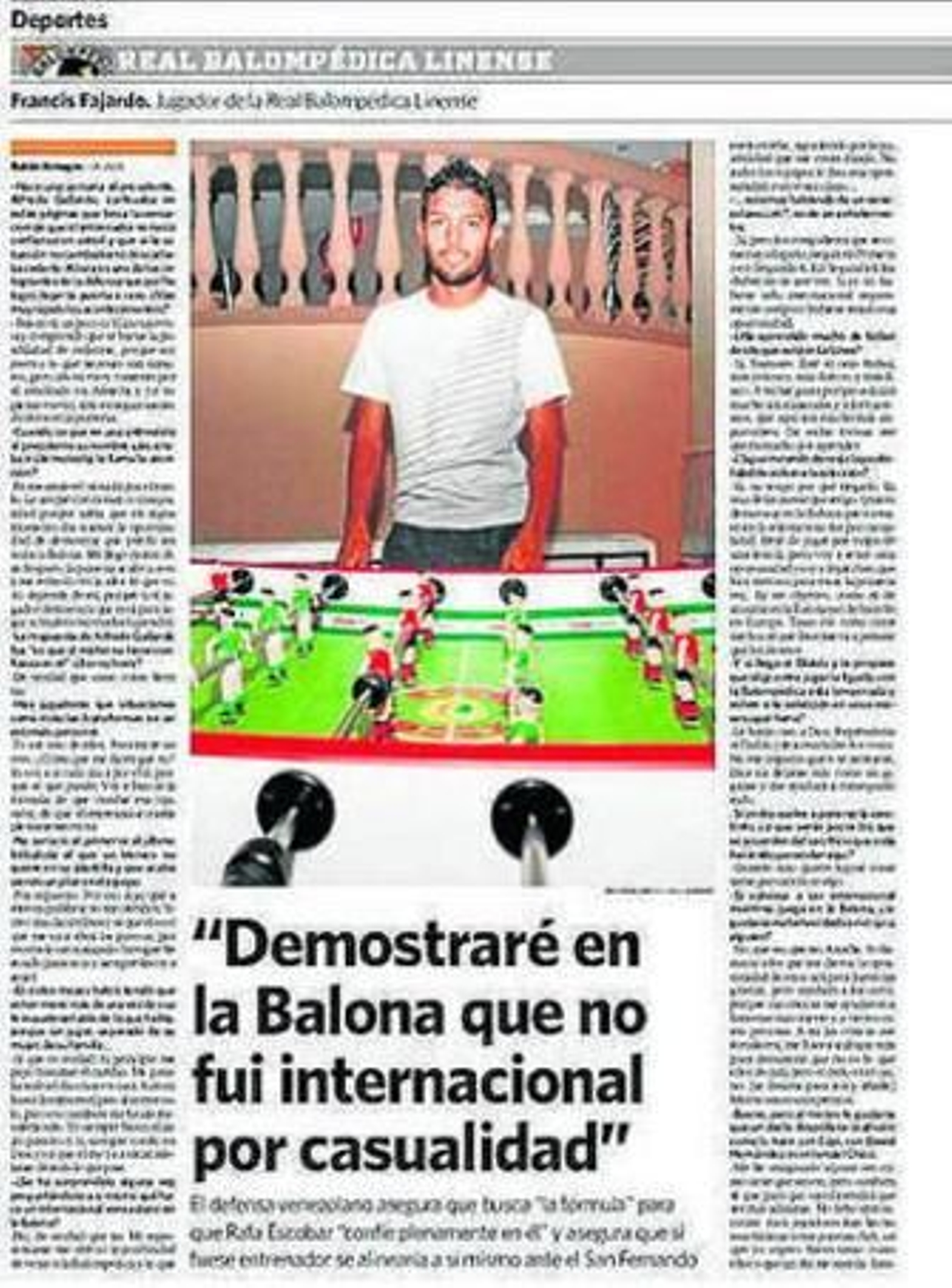 Francis Fajardo ha demostrado ser un tipo de palabra. El pasado seis de noviembre, en una entrevista concedida a este periódico, aseguró que demostraría en la Balona que no había sido internacional por casualidad y que volvería a ser convocado por el equipo de su país, Venezuela, mientras vistiese la camisola de la centenaria entidad de La Línea. El pasado jueves el seleccionador nacional incluyó al zaguero albinegro en una convocatoria en Madrid entre los días cuatro y siete de febrero, en la que estarán los internacionales de la Vinotinto que se encuentran en Europa y que casi con total seguridad disputarán un amistoso. "Recuerdo esas palabras y ha quedado demostrado que decía la verdad y espero que ésta no sea la última llamada de la selección", dice, con enorme satisfacción, el futbolista.