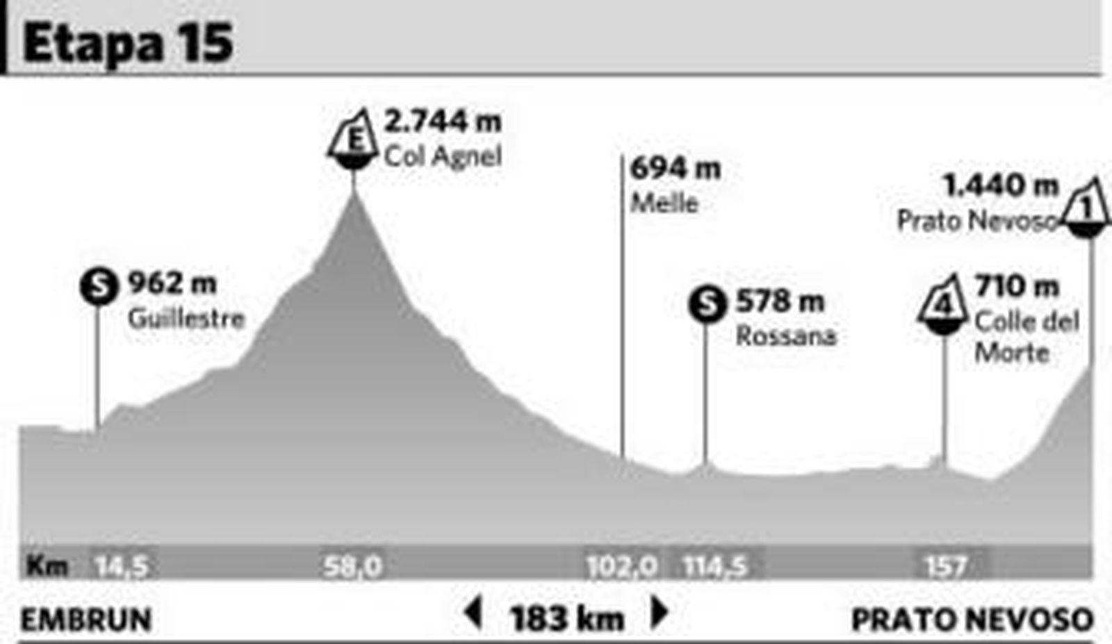 El Tour de Francia entra ahora en territorio italiano para la disputa de la decimoquinta etapa entre Embrun y Prato Nevoso, de 183 kilómetros, el tercer final en alto de la presente edición. El Col de Agnel, de categoría especial, servirá de aperitivo antes del ascenso final, de 11,4 kilómetros al 6,9% de desnivel y servirá para abrir boca con la llegada en pleno de los Alpes a la ronda gala.