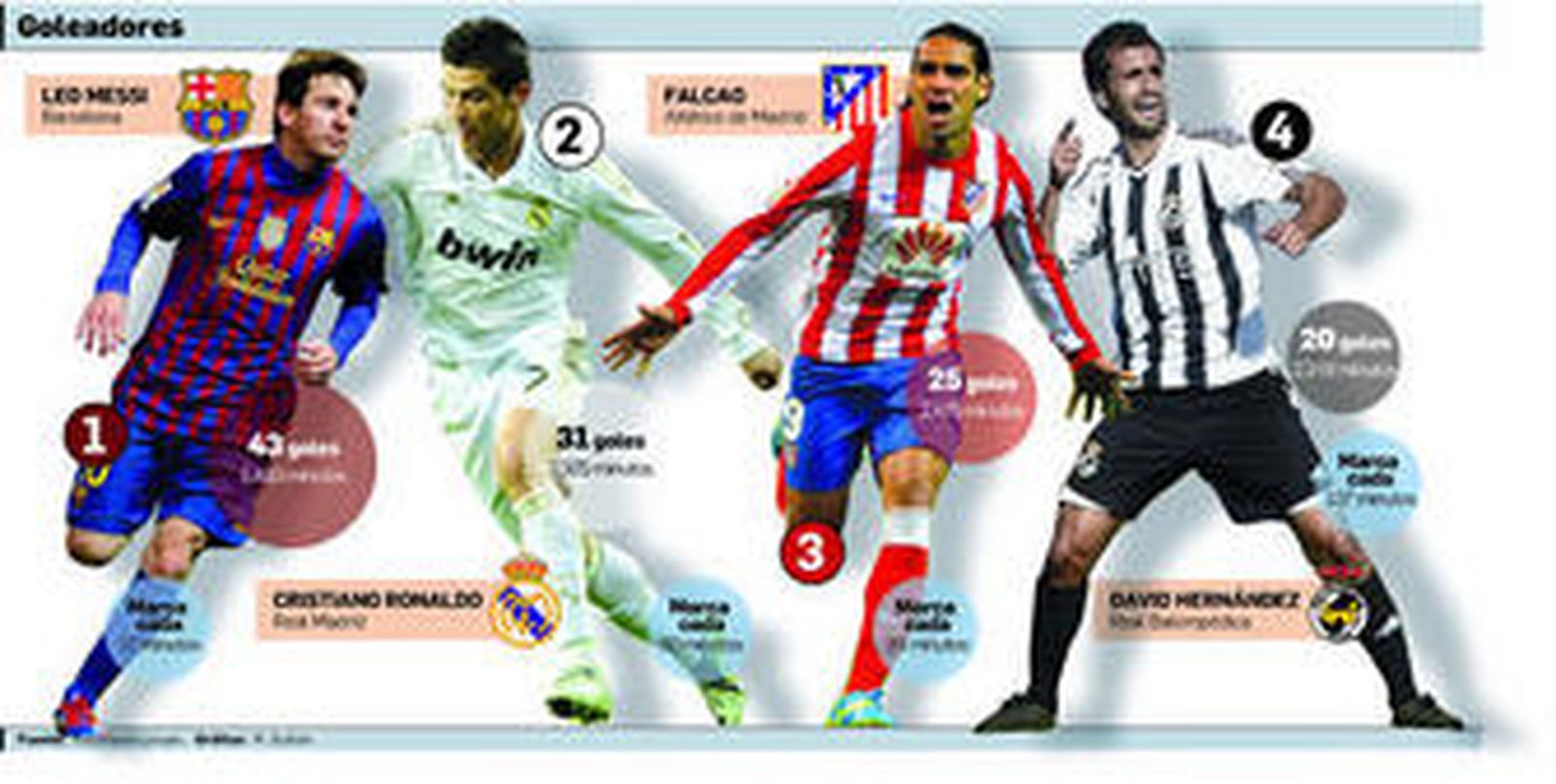 En lo que se refiere sólo a la competición liguera, la estratosférica cifra de Messi (un gol cada 57 minutos) propicia que sólo Cristiano Ronaldo pueda seguir su estela y muy de lejos (80). En unos números más terrenales se mueve Falcao, que precisa 99. Entre los goleadores de Primera, Segunda y Segunda división B el siguiente es David Hernández, al que una lesión apartó en la primera vuelta de la competición durante seis jornadas y que pese a ello sólo ha necesitado 2.149 minutos para marcar 20 veces, dos de ellas, precisamente en las dos últimas jornadas, desde el punto de penalti.