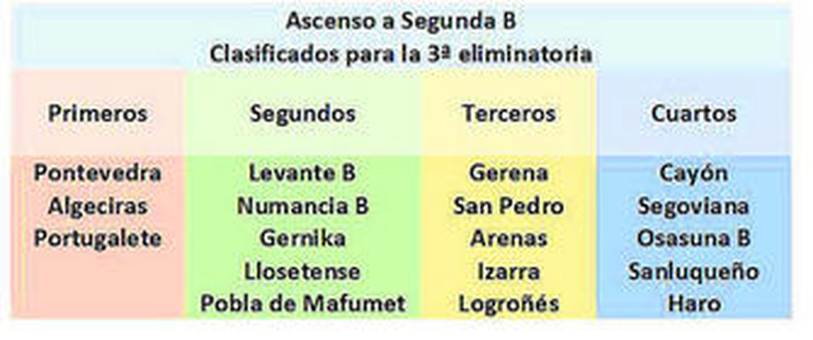 Club Deportivo Cayón (Cantabria), Gimnástica Segoviana (Castilla y León), Osasuna B (Navarra) y Club Deportivo Haro (La Rioja). Uno de estos cuatro equipos quedará hoy emparejado con el Algeciras CF en la ronda final de la fase de ascenso a Segunda división B, que se sortea a partir de las 17:00 horas en la Ciudad Deportiva Las Rozas (Madrid).