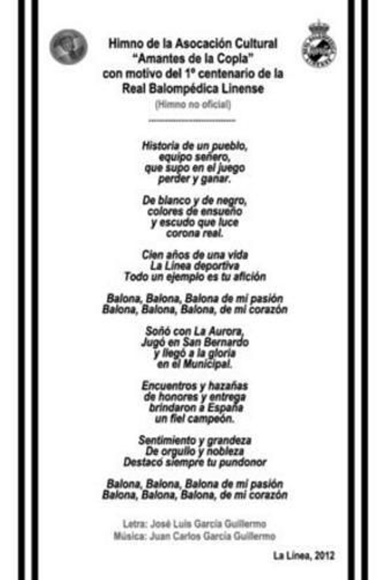 Pepe Infante, máximo responsable de Amantes de la Copla, solicitó al exconcejal popular José Luis García Guillermo y a su hermano Juan Carlos (exintegrante de El Último de la Fila y en la actualidad percusionista de Manolo García) que confeccionasen un himno con motivo del homenaje que su entidad organizó para la Real Balompédica en el Palacio de Congresos hace ya varios meses. "No habían pasado diez minutos y ya lo tenía en mi correo electrónico", explica Infante, que confiesa que quedó sorprendido.