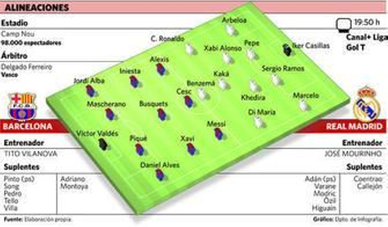 Mientras, un triunfo del Barcelona, líder de la liga con pleno de triunfos, dejaría a los pupilos de Tito Vilanova once puntos por encima de su máximo rival, por lo que las opciones de que el Real Madrid retuviera el título responderían a una hazaña.