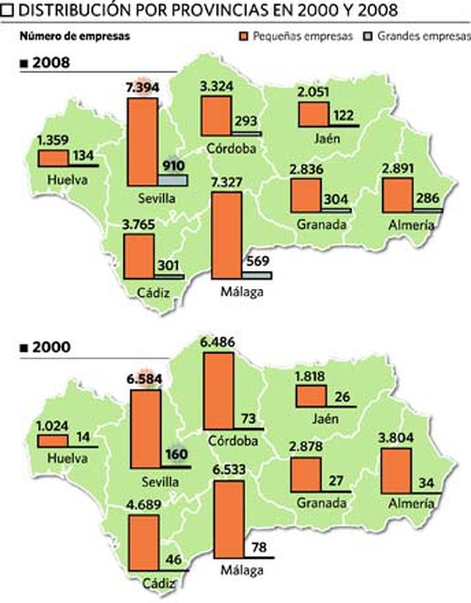 Andalucía, tras Cataluña, cuenta con el mayor número de empresas del país (alrededor del 15%), aunque le correspondería por tamaño un porcentaje mayor. Si bien la mayor parte de las empresas se localizan en Sevilla y Málaga, Almería y Granada crecen más que el resto de provincias en creación de nuevas empresas, que además viven en muchos casos de las exportaciones. O sea, nuestra empresa tipo es pequeña (nueve de cada diez son microempresas; dos de cada tres son empresarios individuales), era constructora o inmobilaria y es masivamente una empresa de servicios y familiar. El número de empresas andaluzas, a pesar de los pesares, creció mucho más intensamente que la media española. En 2005, la población de empresas constructoras se duplicó en Andalucía con respecto a 1995, y desde el mismo 2005 hasta 2007, una de cada tres empresas nuevas creadas tenía como objeto social dicha actividad. De ahí que nuestro sufrimiento a partir de 2008 haya sido más intenso que en otros territorios, y nuestra pérdida de masa empresarial y de empleo, también.