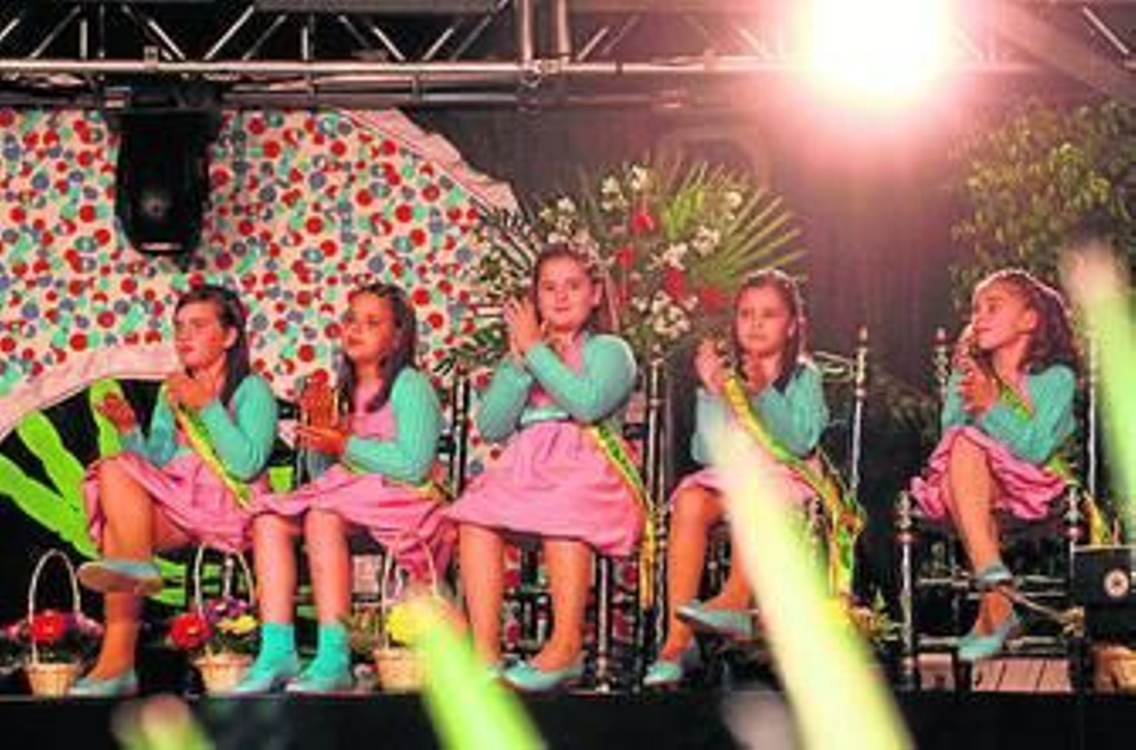 Un sencillo escenario decorado como el interior de una caseta, con dos abanicos gigantes y sillas de anea junto a sendos tronos de terciopelo rojo, acogieron a las cortes infantil y juvenil que subieron acompañadas por familiares y observados con atención por sus allegados, cámara en mano, para no perder un detalle. Primero ascendieron las pequeñas de la corte infantil, encabezada por Loreto Correro como reina y completada con las pequeñas Manuela Muñoz, Lidia Mena, Amaya Carbonell, María Calvente y Alba María Román, así como la reina saliente vestidas con unas sencillas rebecas celestes. Tras ellas, las jóvenes Macarena Ortega (reina juvenil) seguida de Lorena Fuentes, Anabel Gutiérrez, Patricia Jiménez, Lorena Jiménez, Alba Llopes y Paola Toro, quienes lucieron unos bellos trajes de color rosado salvo la reina y su predecesora, Sara Lobato, con espectaculares vestidos.