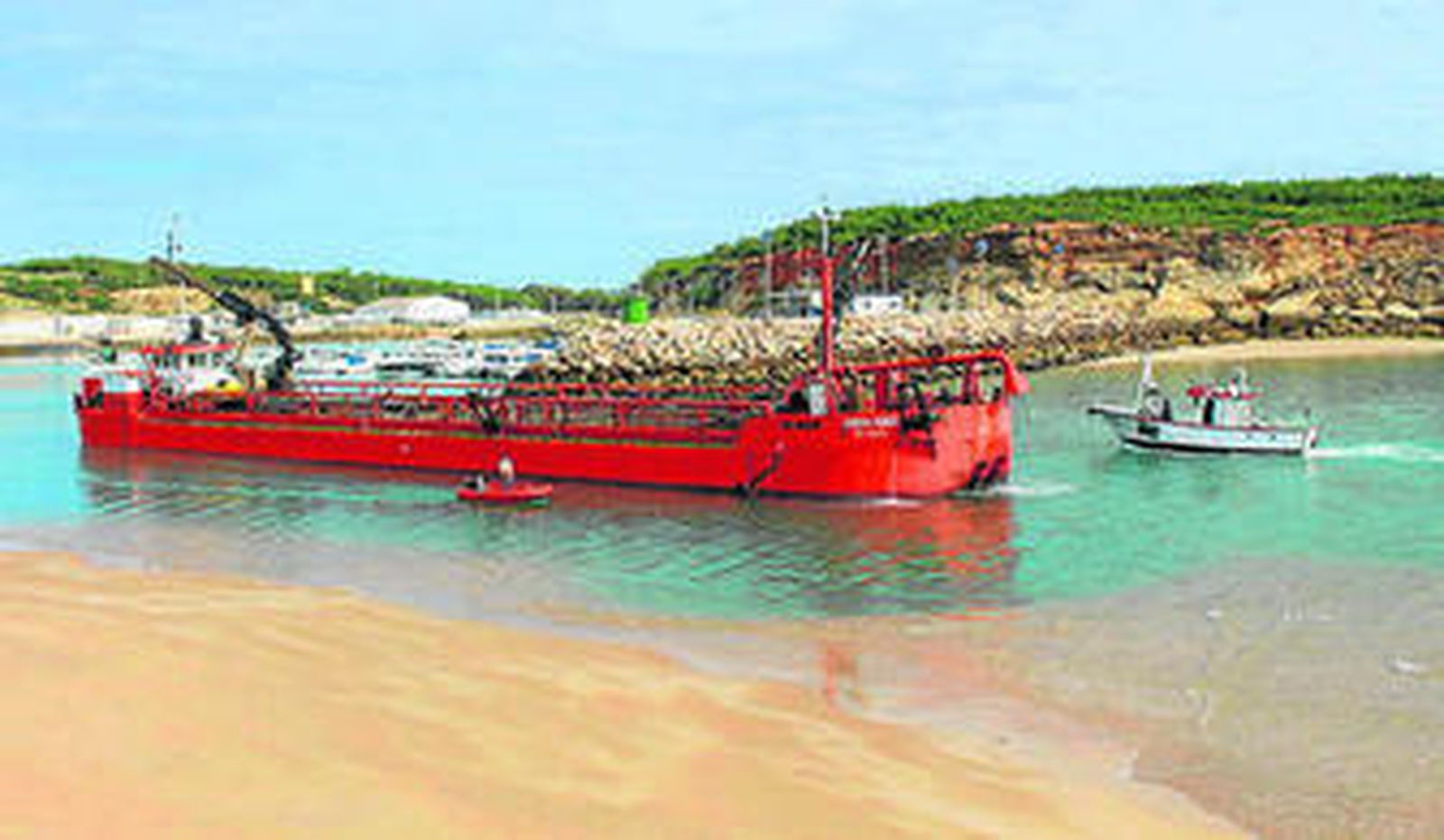 El objetivo es restituir un calado mínimo de 2,5 metros de profundidad en la mayor bajamar del año. De hecho, las barcazas de la almadraba, encargadas del montaje de este arte y de mayor calado que los barcos pesqueros, ya pueden entrar y salir sin dificultad tras abrirse en la bocana del puerto un canal de dos metros y medio de calado.