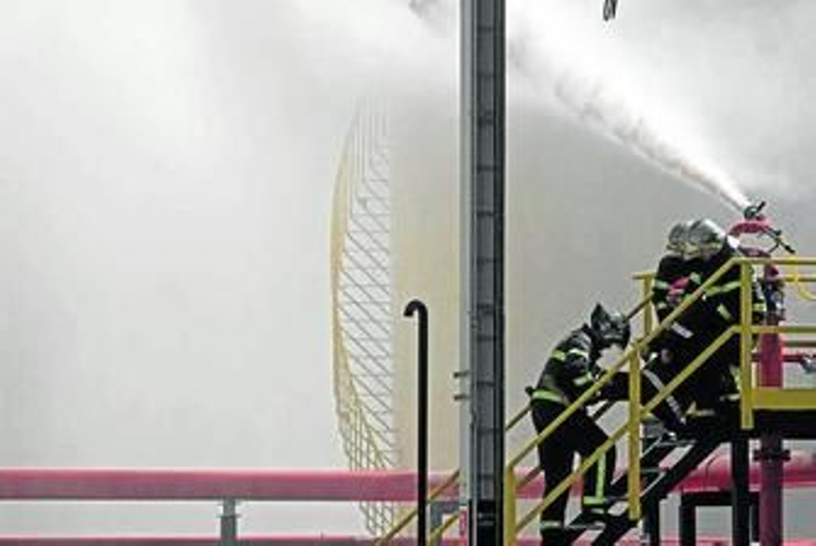 Los bomberos simulan la extinción de un fuego en un tanque de CLH