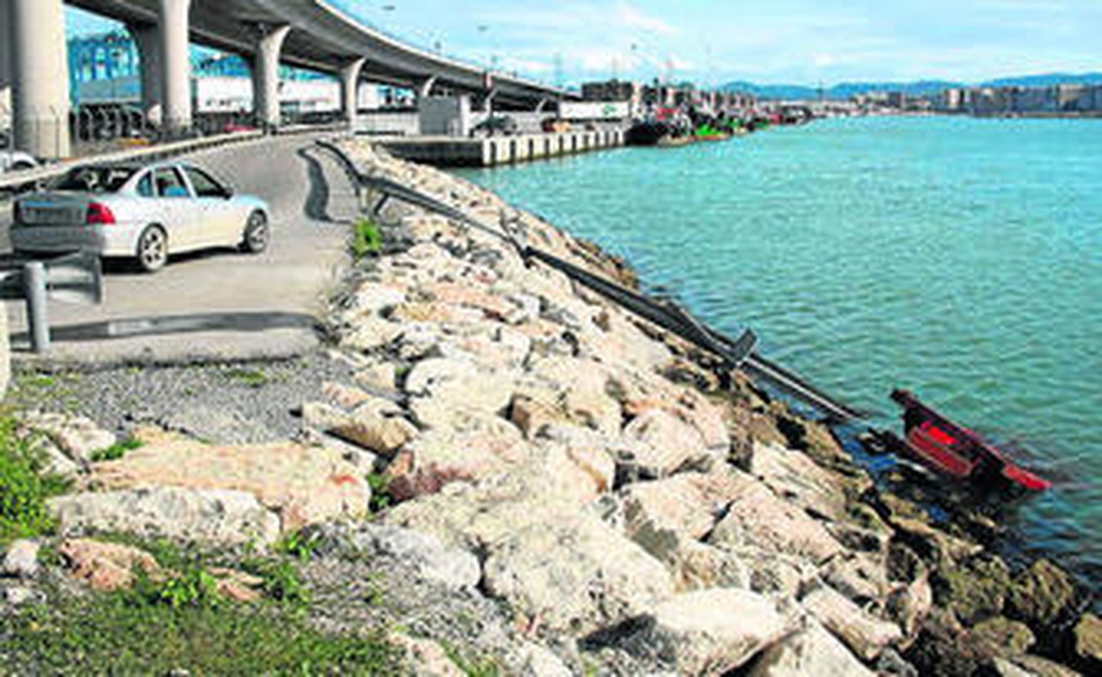 Un camión con matrícula de Sevilla perdió ayer su remolque cuando circulaba por el puerto de Algeciras, debajo del puente del acceso norte a la zona. Fuentes de la Autoridad Portuaria explicaron que el suceso ocurrió alrededor de las 13:00 horas de ayer, cuando al vehículo, que circulaba por la curva cerrada que se traza bajo el puente, se le soltó la batea, que se encontraba sin carga. Debido a la inercia de la curva, el remolque continuó solo su camino en dirección contraria a la que llevaba la cabeza tractora, derribó el quitamiedos y cayó al agua, sin haber tenido que lamentar más daños que los materiales en las instalaciones y los que provocará sacar la batea del agua. Durante la tarde aún se encontraba allí.