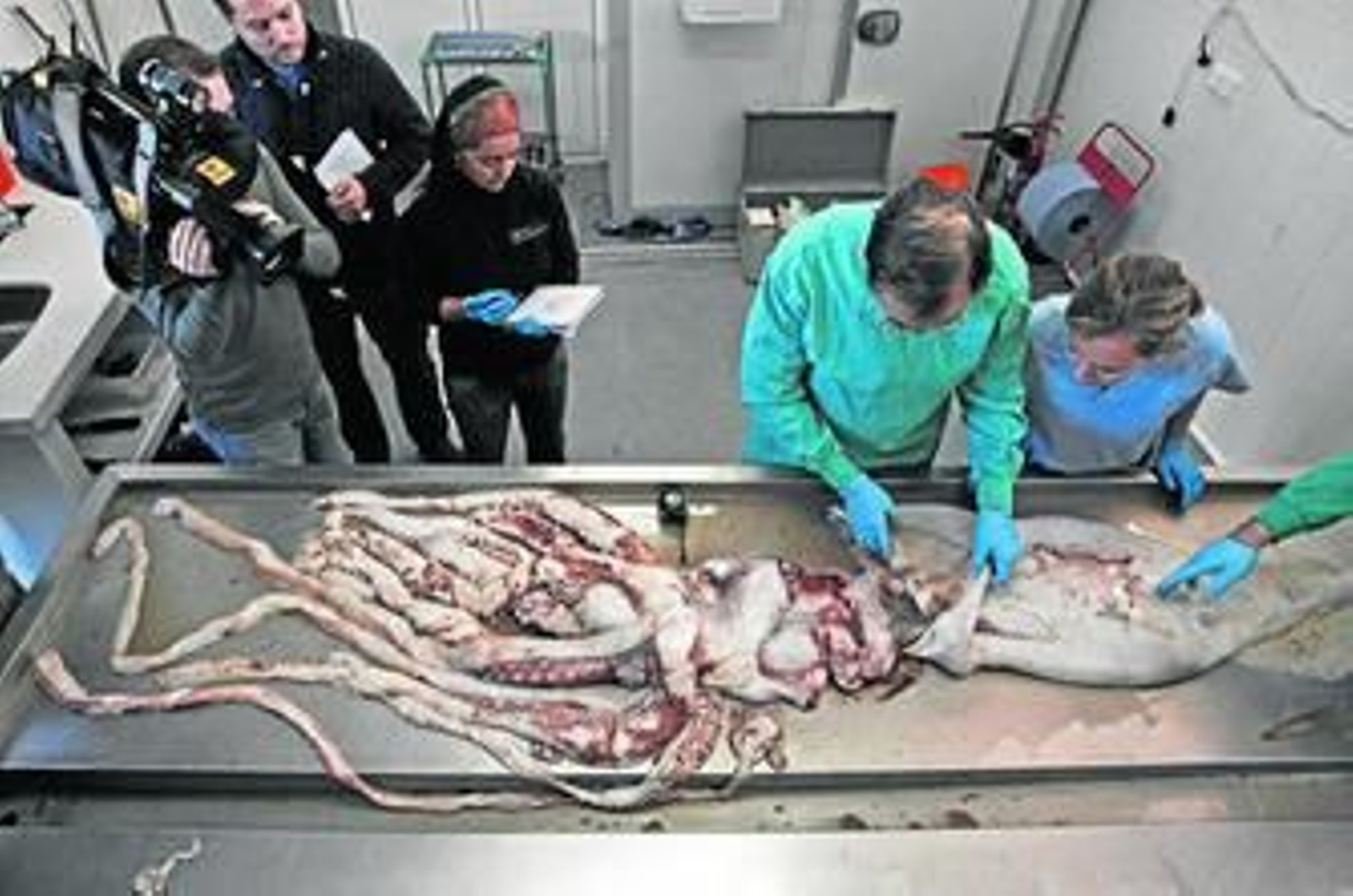 Entre cámaras, periodistas, y envuelto en un fuerte olor a amoniaco, el profesor del Centro Superior de Investigaciones Científicas (CSIC), Ángel Guerra -quizá uno de los mayores expertos en la especie tras necropsiar más de medio centenar de cefalópodos en todo el mundo-, midió los restos de brazos, diseccionó y estudió cada uno de los órganos del calamar que, cuando se encontró, medía 3,6 metros y pesaba 70 kilos. Tras permanecer meses congelado, su tamaño se ha visto mermado. Tras la biometría, se pensó que pudo haber tenido una longitud de unos 6 metros. "Este animal que ha varado aquí es muy interesante, probablemente porque los del Mediterráneo hayan entrado desde el Estrecho. Pienso que no hay una población estable en el Mediterráneo", valoró el experto, que admitió que este cadáver no es el mayor que ha visto. "El más grande fue una hembra de 170 kilos y 16 metros de largo. Los machos y las hembras se diferencian mucho de tamaño. Y ésta es una hembra joven", concluyó.