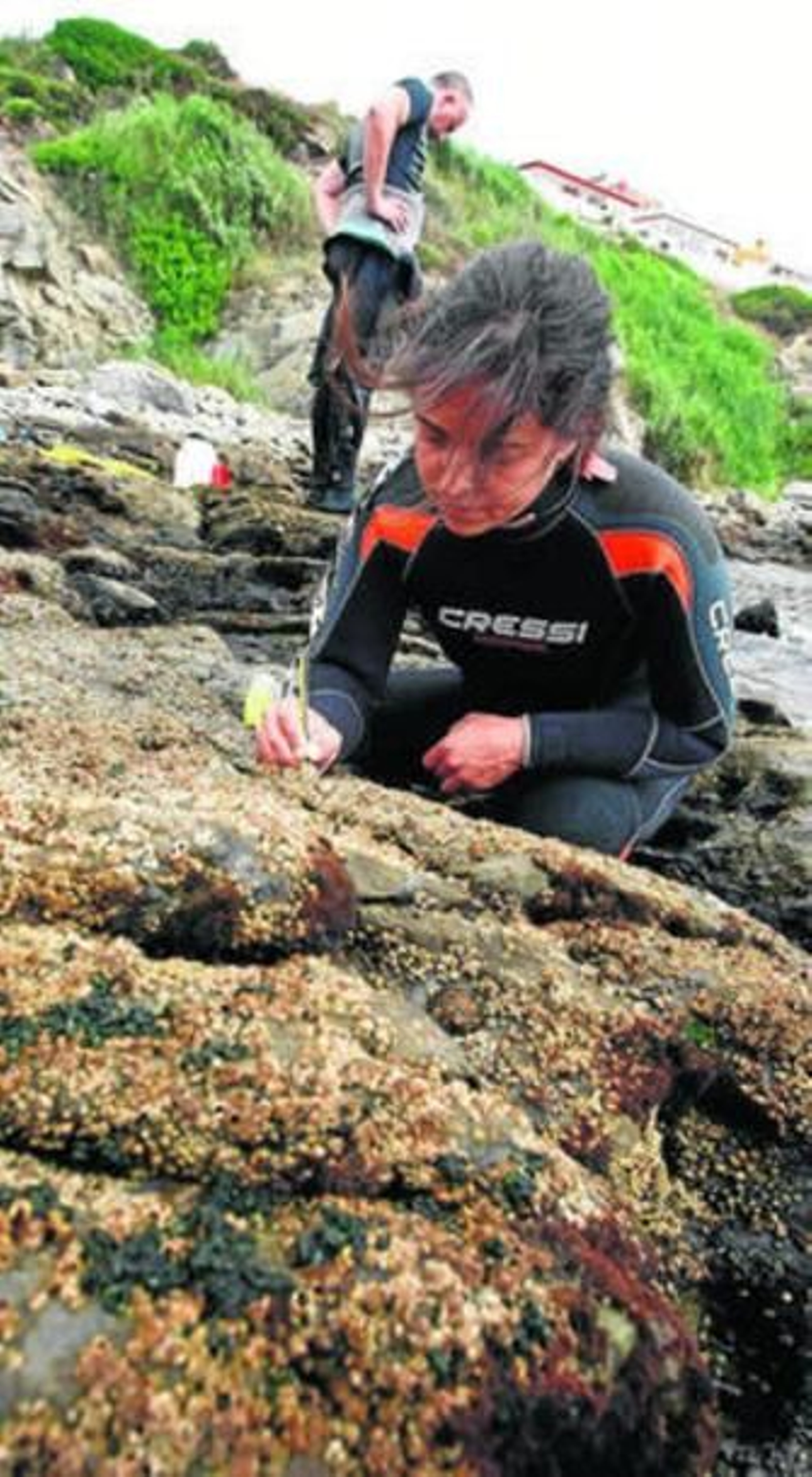 Para encontrar la primera no hace falta que el agua llegue por encima de la rodilla. "La principal amenaza de las lapas es el hombre. Creemos que suelen utilizarse como carnada para la pesca", cuenta Manuel. María del Carmen coge la regla y le indica la talla. "Ésta mide 5 centímetros de longitud", indicó mientras su compañero anotaba los datos, junto a las coordenadas exactas de su posición para, después en la oficina, cotejar datos y establecer una tasa de crecimiento y calcular la edad. "El año que viene puede haberse movido un metro o dos, no más", explicó. Una masilla verde marca su rastro, aunque tampoco conviene llamar la atención. "De hecho, creo que ahora la voy a quitar", dijo la bióloga marina. El año que viene, el GPS no miente.