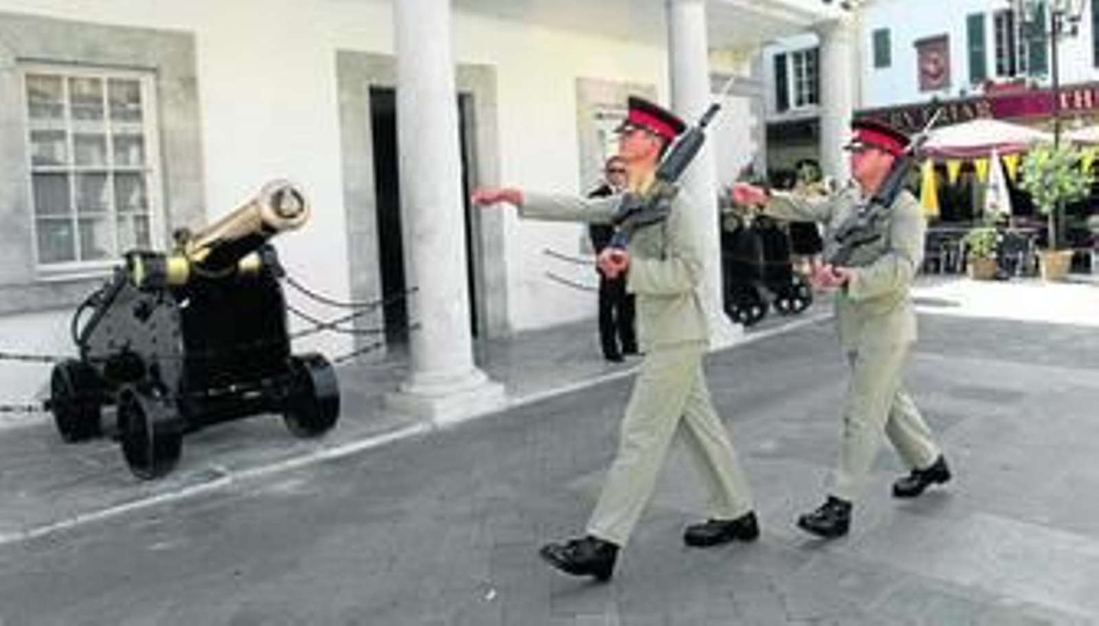 Dos guardias del Royal Gibraltar Regiment desfilan por Convent Place a mediodía.