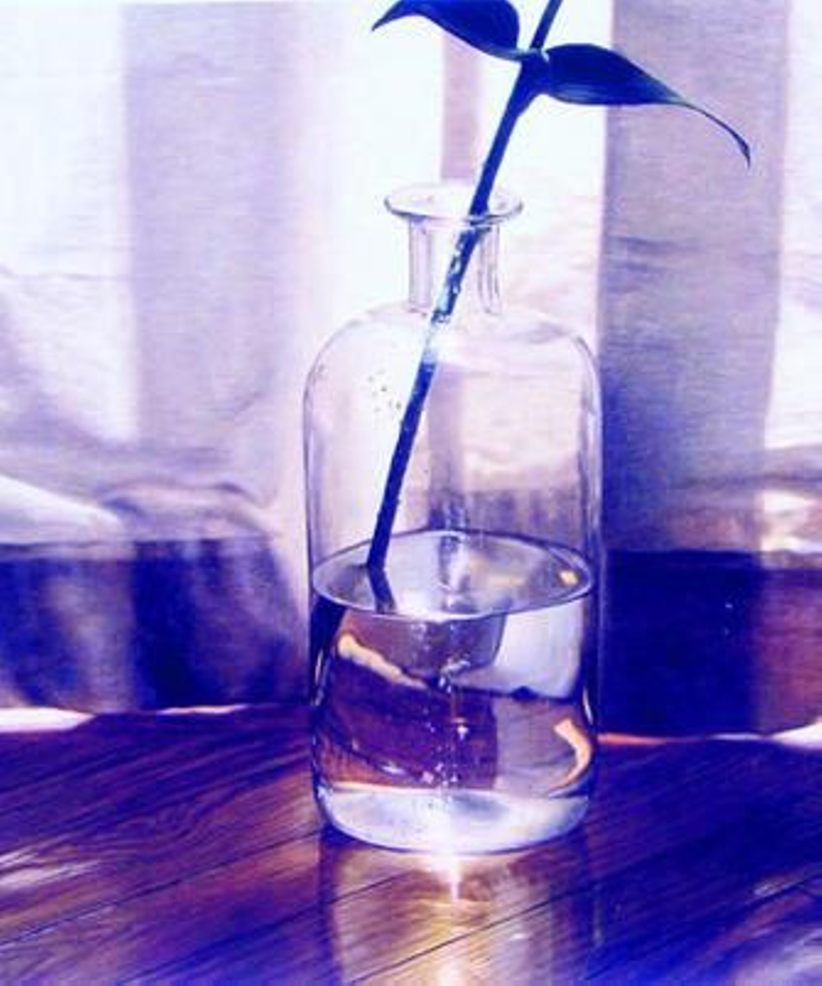 En la muestra de Granada hay una obra llamada Situación deliberada I. Es, sencillamente, un bodegón: una planta dentro de una botella con agua que hace las funciones de florero. La botella está sobre la mesa. Cuando el espectador comprueba que el agua de esa botella no es una foto, sino que es agua pintada, no puede dejar de mostrar su sorpresa. Pero es cierto, el agua, la botella, la mesa de madera, las gotas de humedad que resbalan por el interior son obra de una mano humana, no de una mano fotográfica.