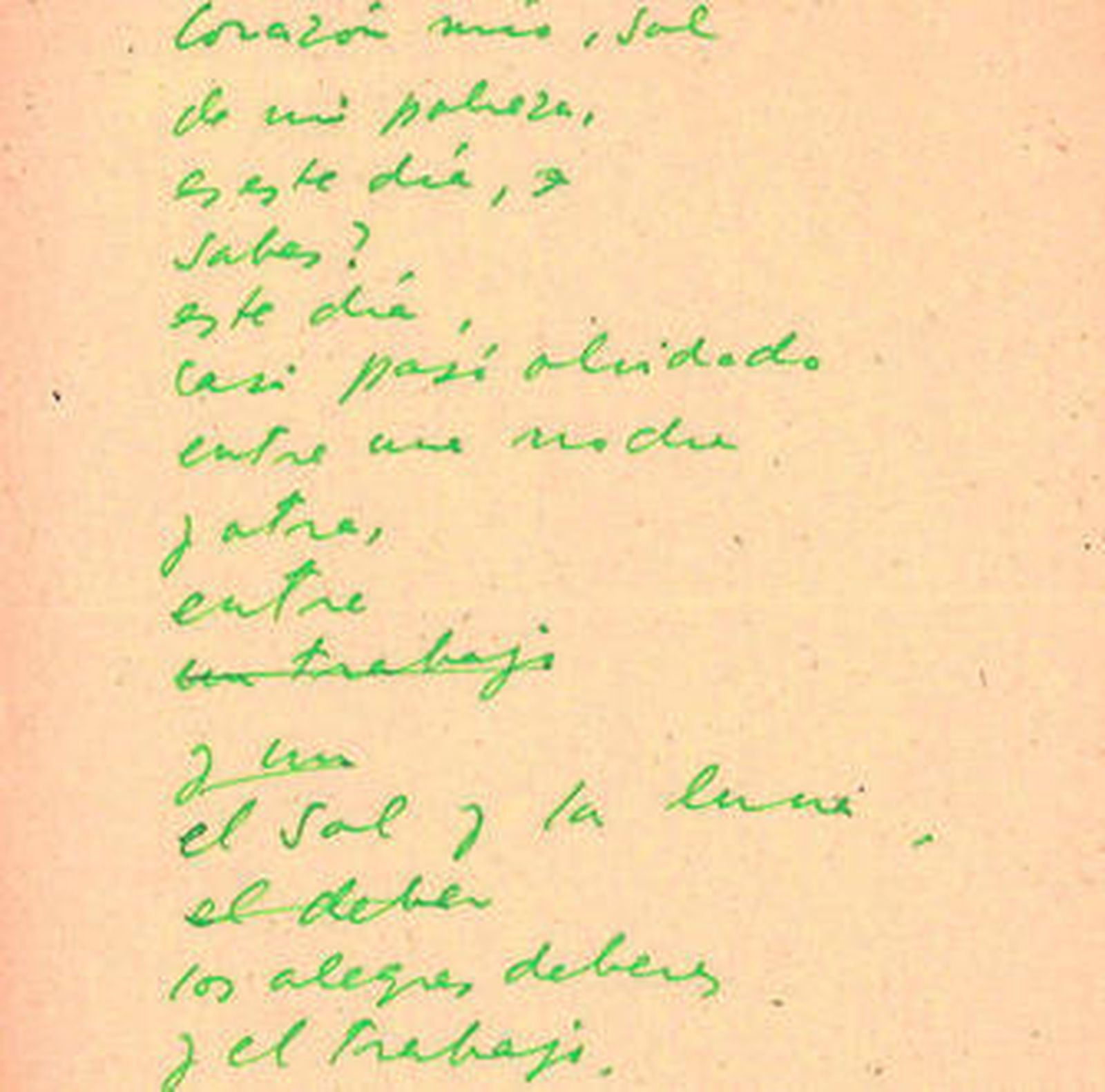 'Corazón mío, sol de mi pobreza, es este día, ¿sabes?'. Así comienza uno de los 21 poemas inéditos de Pablo Neruda descubiertos hace tres años y que acaba de poner a la venta Seix Barral bajo el título Tus pies toco en la sombra y otros poemas inéditos de Pablo Neruda.
