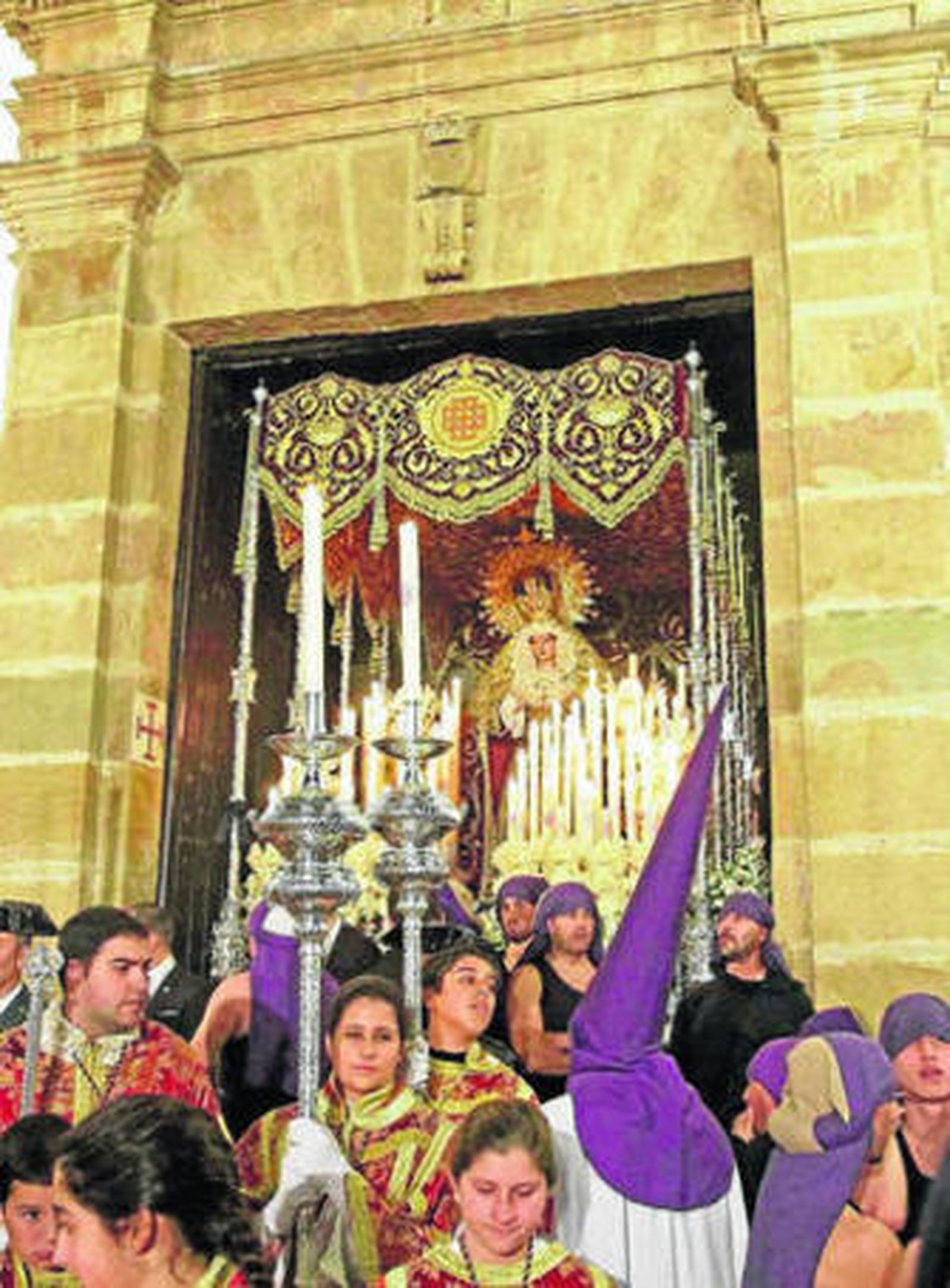 La gente recibió con aplausos al Nazareno, con las notas de la Agrupación Musical Nuestra Señora del Juncal de Sevilla. Como ocurre con esta imagen, un hermano subió al paso de misterio (con nuevos faroles laterales) para colocar las dos partes de la cruz sin las que abandona el templo la talla así como sus potencias, que precisamente ayer lució de estreno, en un año además en el que se cumple el 75 aniversario de la bendición de la hechura.
