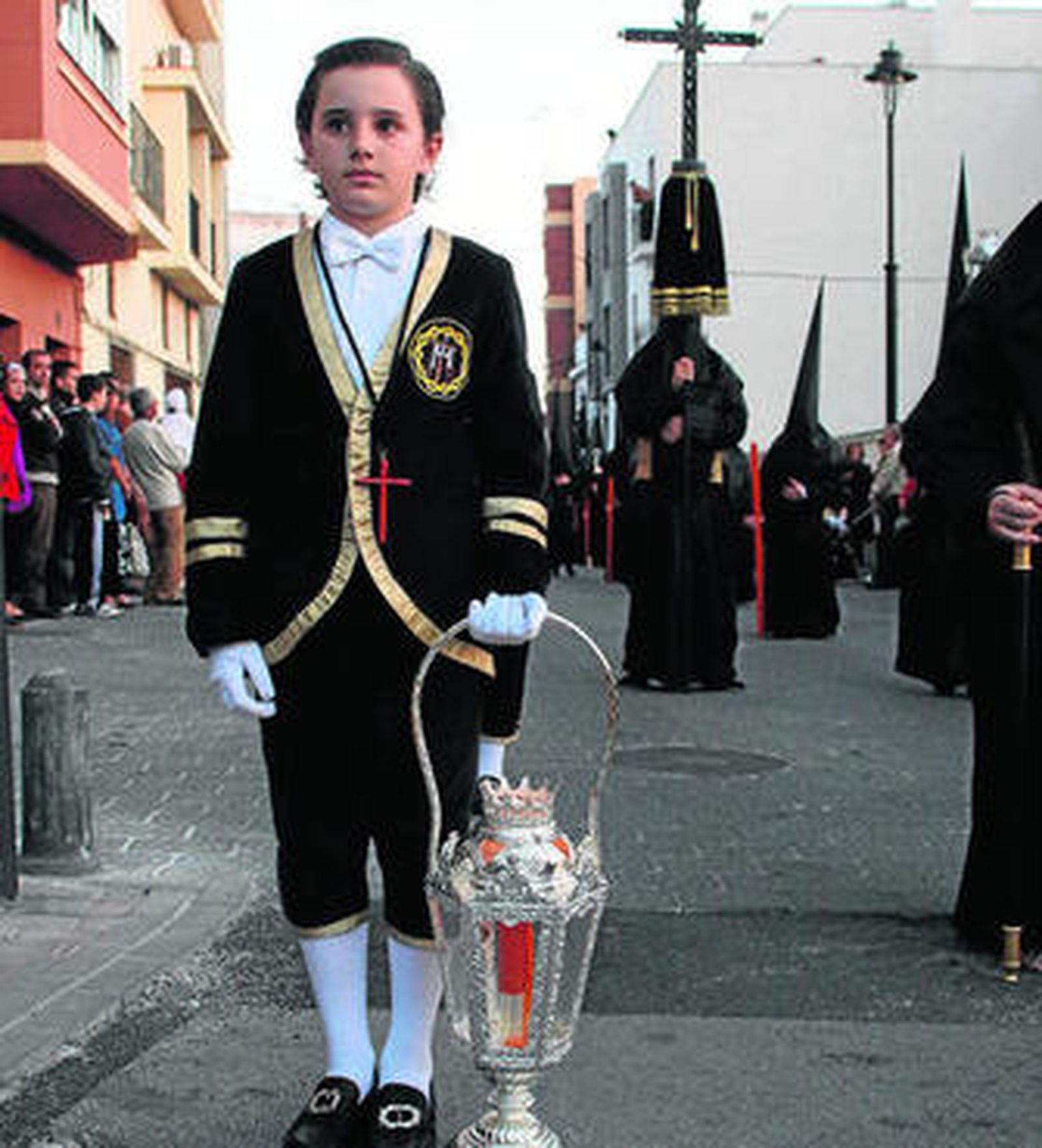 El centenar de penitentes de la Sagrada Mortaja se distinguió del resto. Y no es por el color. La percalina negra de cola de alto capirote y el esparto ancho ceñido a la cintura suponen un ante y un después en la Semana Santa algecireña. Además, este año la hermandad quiso que la salida se adelantara y la gente lo agradeció. Todo un acierto. Teniente Miranda y Blas Infante se llenaron para ver la solemnidad.