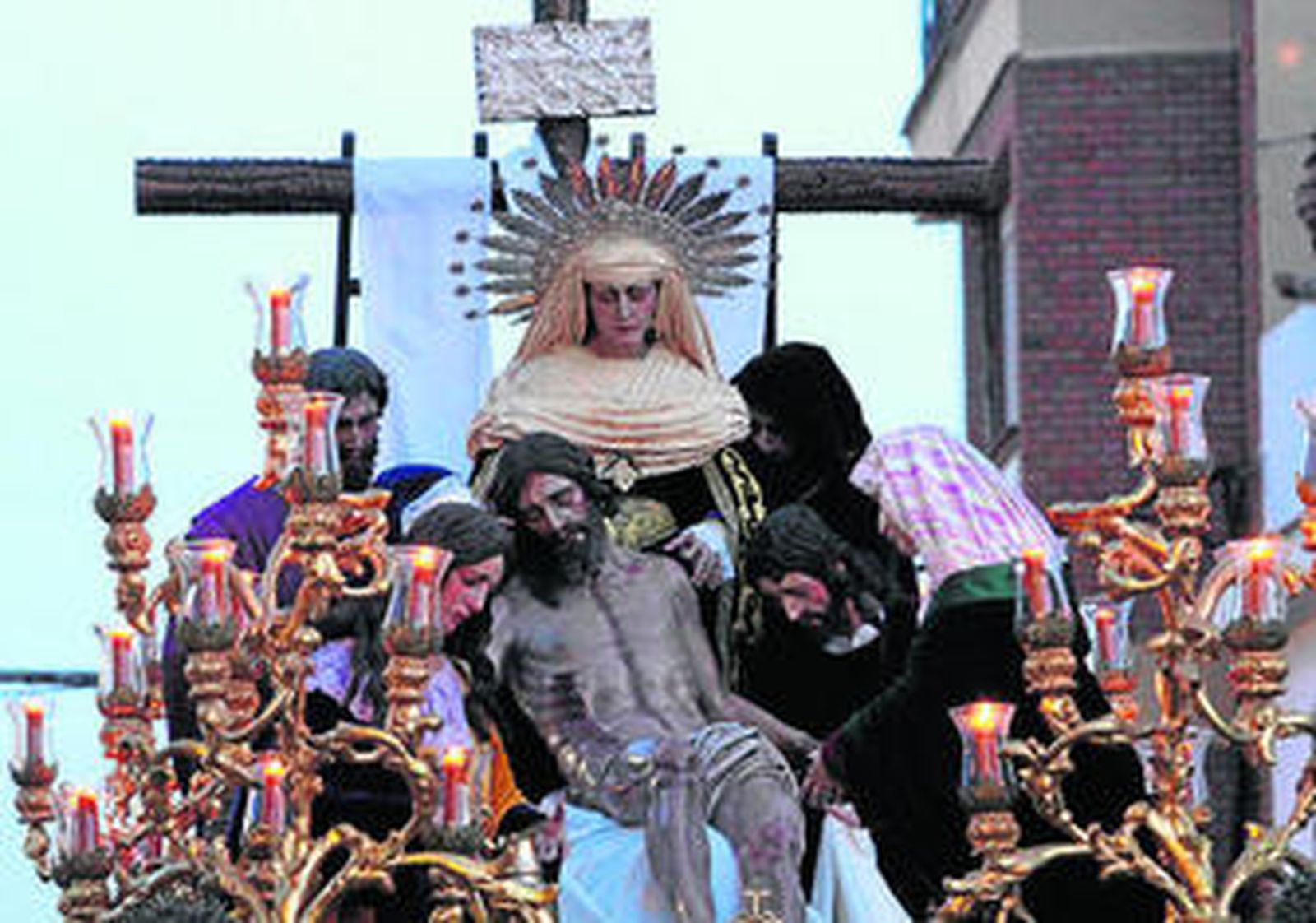 El lema de la Sagrada Mortaja lo dice todo: "Toma tu cruz y sígueme". Y un par de nazarenos lo siguieron al pie de la letra con su cruz a cuestas. Los costaleros hicieron las paradas necesarias si se tiene en cuenta que portan el pasaje evangélico en el que Cristo yace muerto en los brazos de su madre junto a las tres Marías, Nicodemo, San Juan y José de Arimatea.